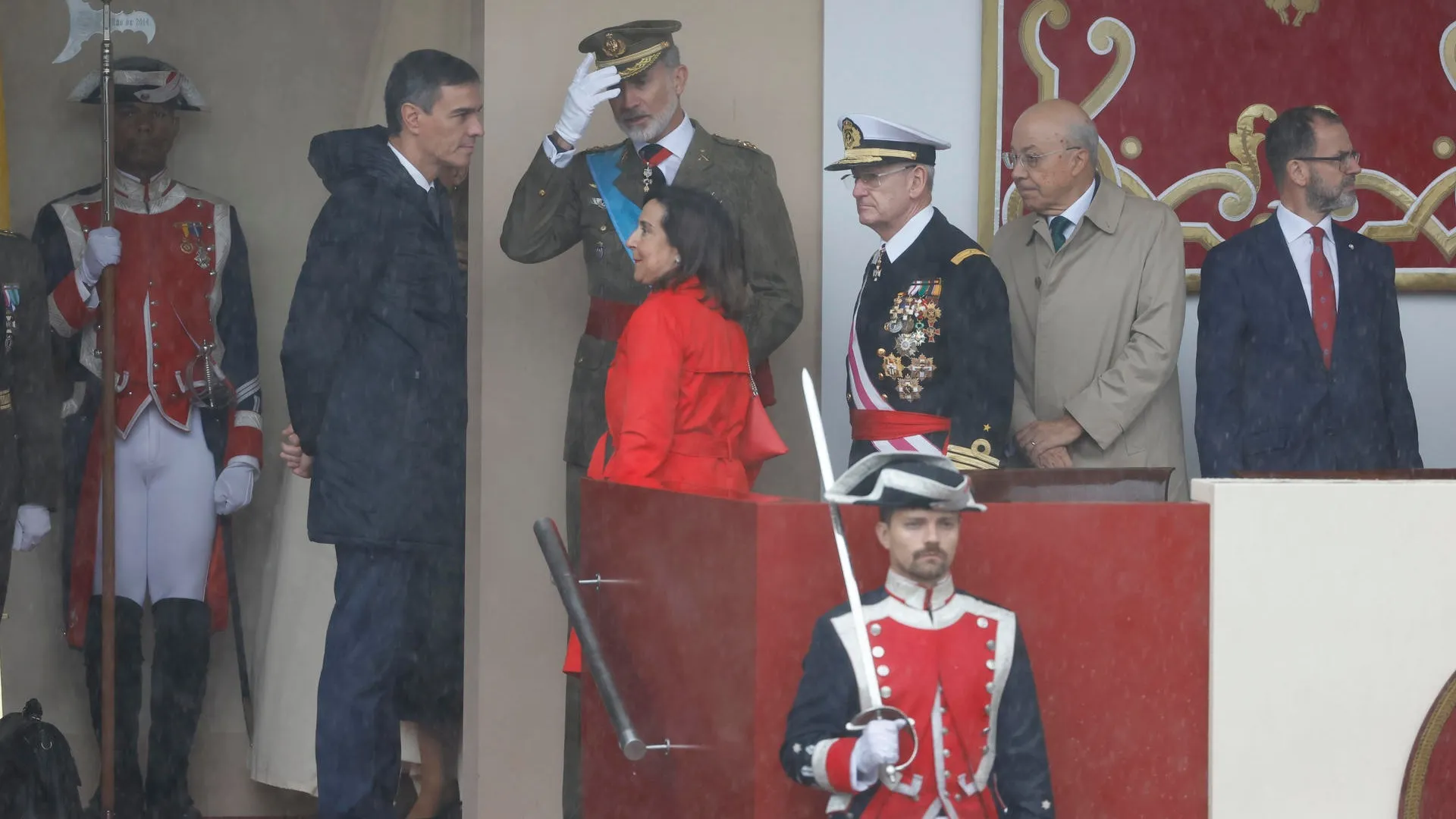 En un momento del desfile, ante la fuerte lluvia que caía, la Reina se ha retirado unos pasos hacia atrás de su puesto y el Rey ha llamado al presidente del Gobierno, Pedro Sánchez, y a la ministra de Defensa, Margarita Robles, que han conversado durante unos segundos.