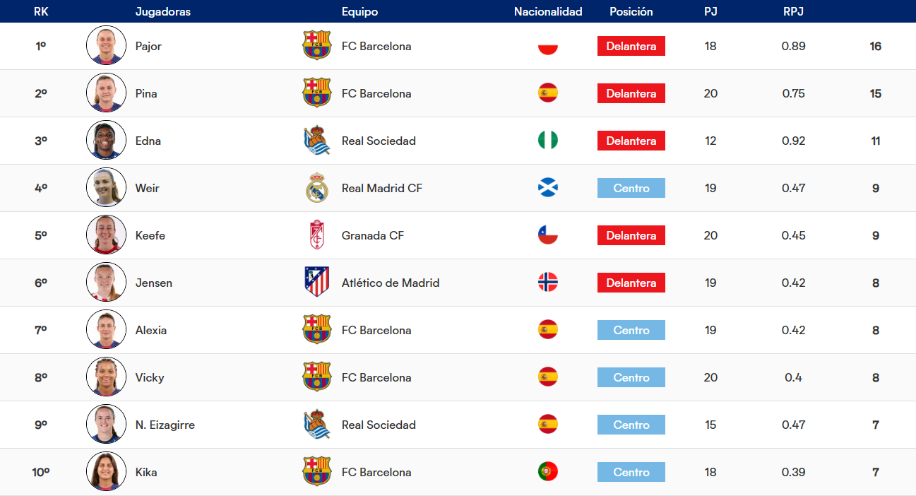Su valor de 1,18 goles por cada 90 minutos la coloca en lo más alto de la eficiencia goleadora, demostrando que aprovecha cada instante sobre el verde para castigar la portería rival. Además, su peligro es polifacético; es la máxima anotadora desde fuera del área con 3 tantos, lo que obliga a las defensas a saltar a la presión y abandonar la zona de confort. En definitiva, las cifras de Pina explican el constante dolor de cabeza que supone para los sistemas defensivos una jugadora que es, por definición, una máquina de generar ocasiones.