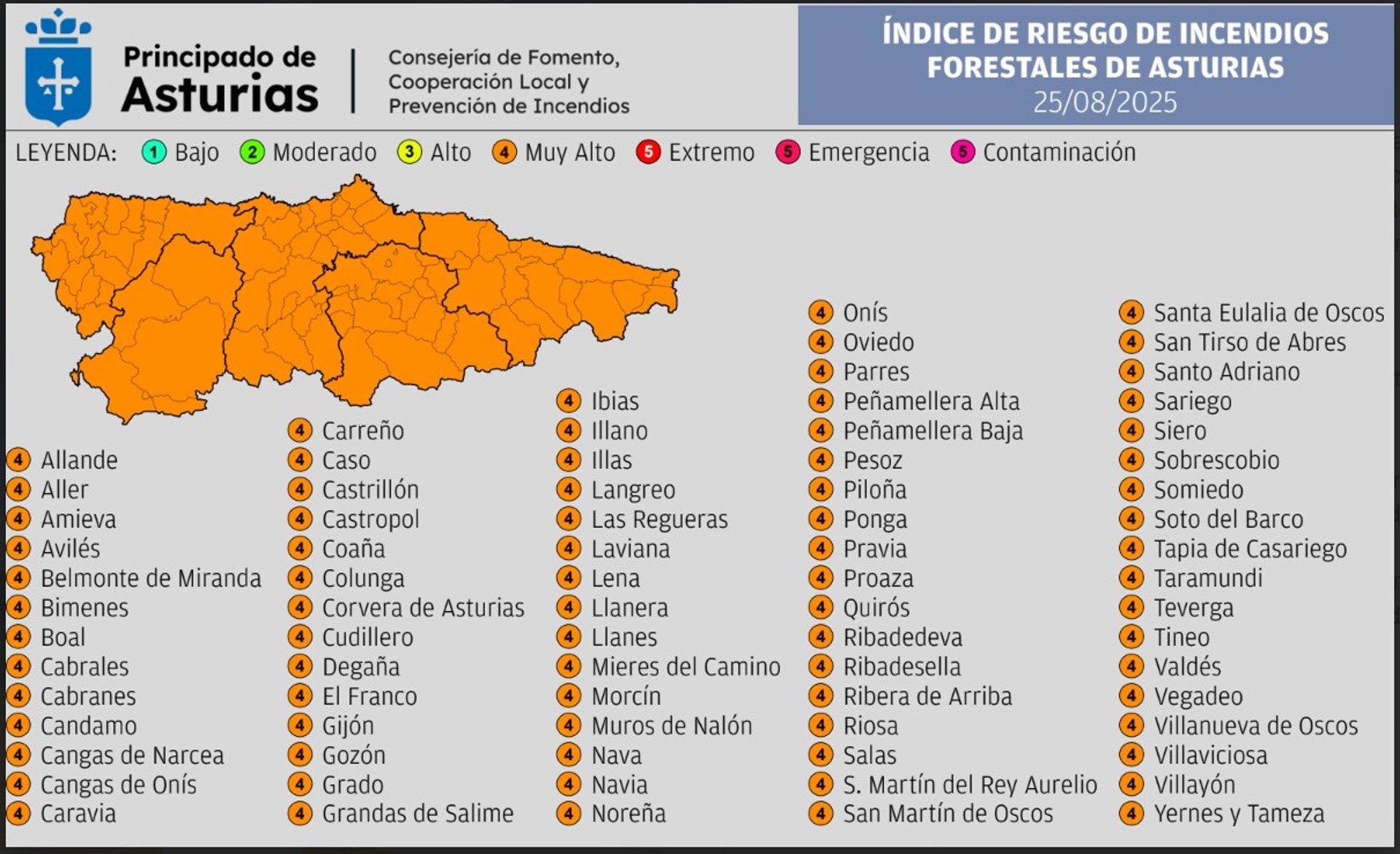 Además, están prohibidas todas las quemas en todos los municipios asturianos mientras permanece activado el Plan de Incendios del Principado de Asturias.