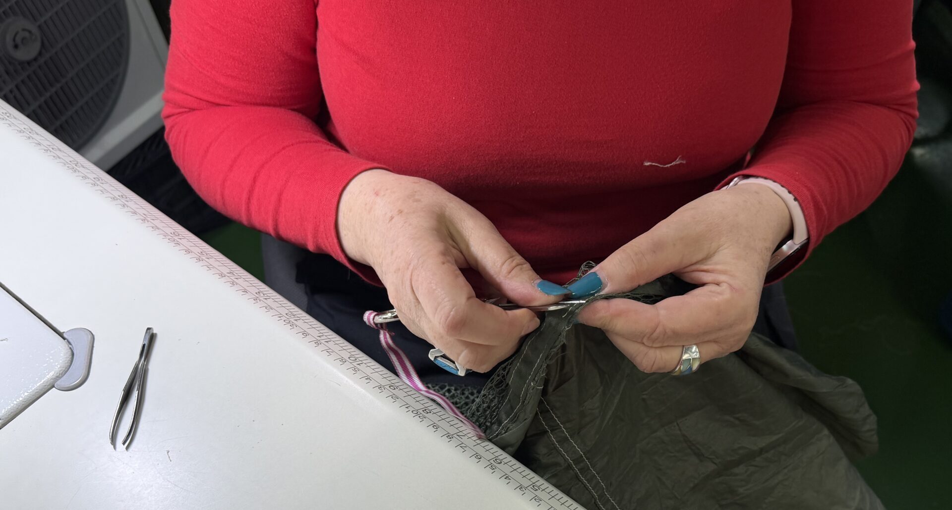 El entrenamiento de una nueva costurera puede durar dos o tres meses. Primero practican con material dado de baja. Luego pasan progresivamente a equipos operativos. Aprenden a medir, a descoser sin dañar, a detectar irregularidades mínimas. Aprenden también a confiar en su propio criterio. “Si lo has hecho bien, ¿cómo te vas a echar para atrás?”, les dicen las veteranas cuando dudan.