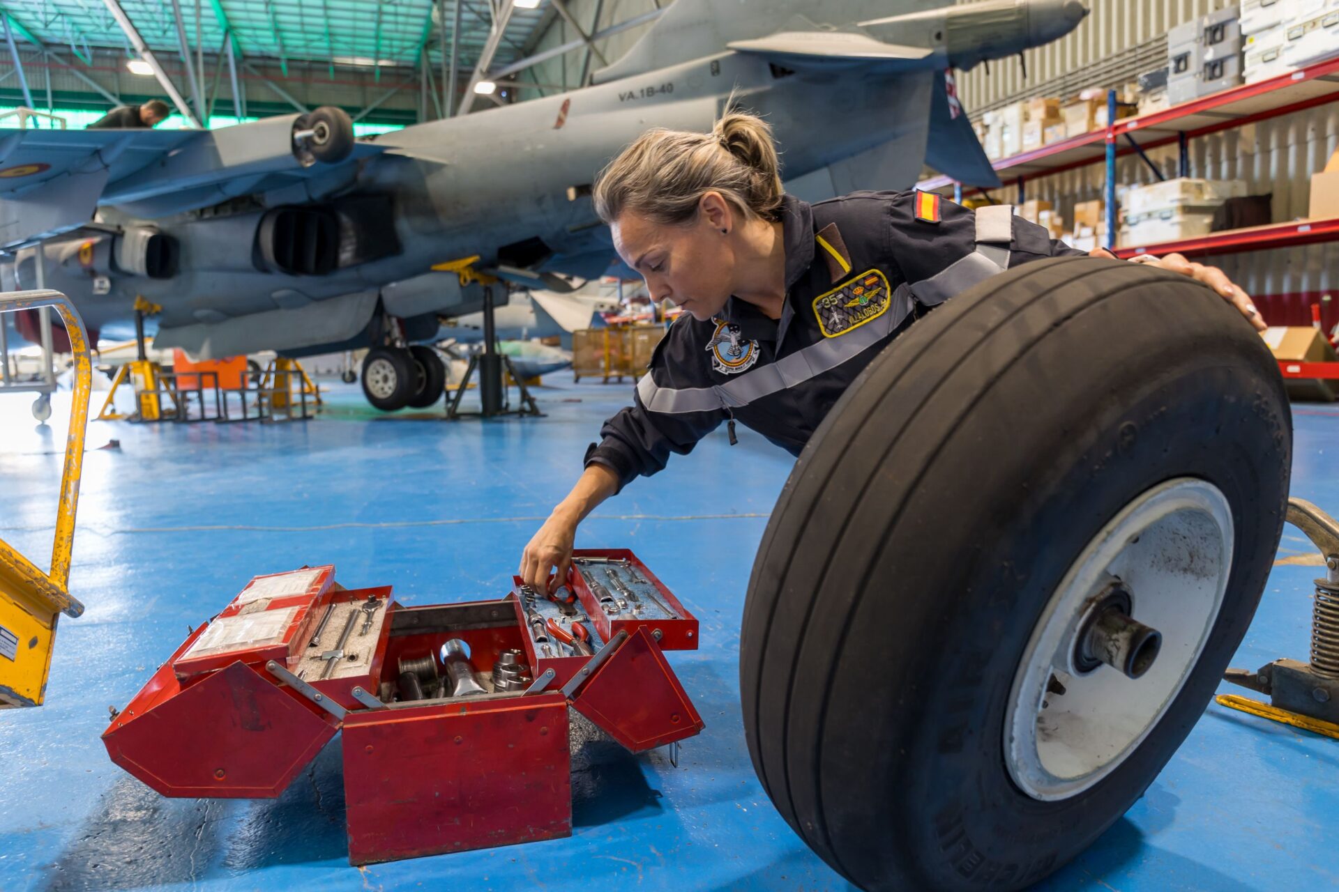 Las tareas de mantenimiento de un avión a reacción de unos 15 metros de longitud, casi 10 metros de envergadura y unos 3 metros y medio de altura, no son nada fáciles. Implica mucho conocimiento y cargar con objetos muy pesados, entre otras cosas.