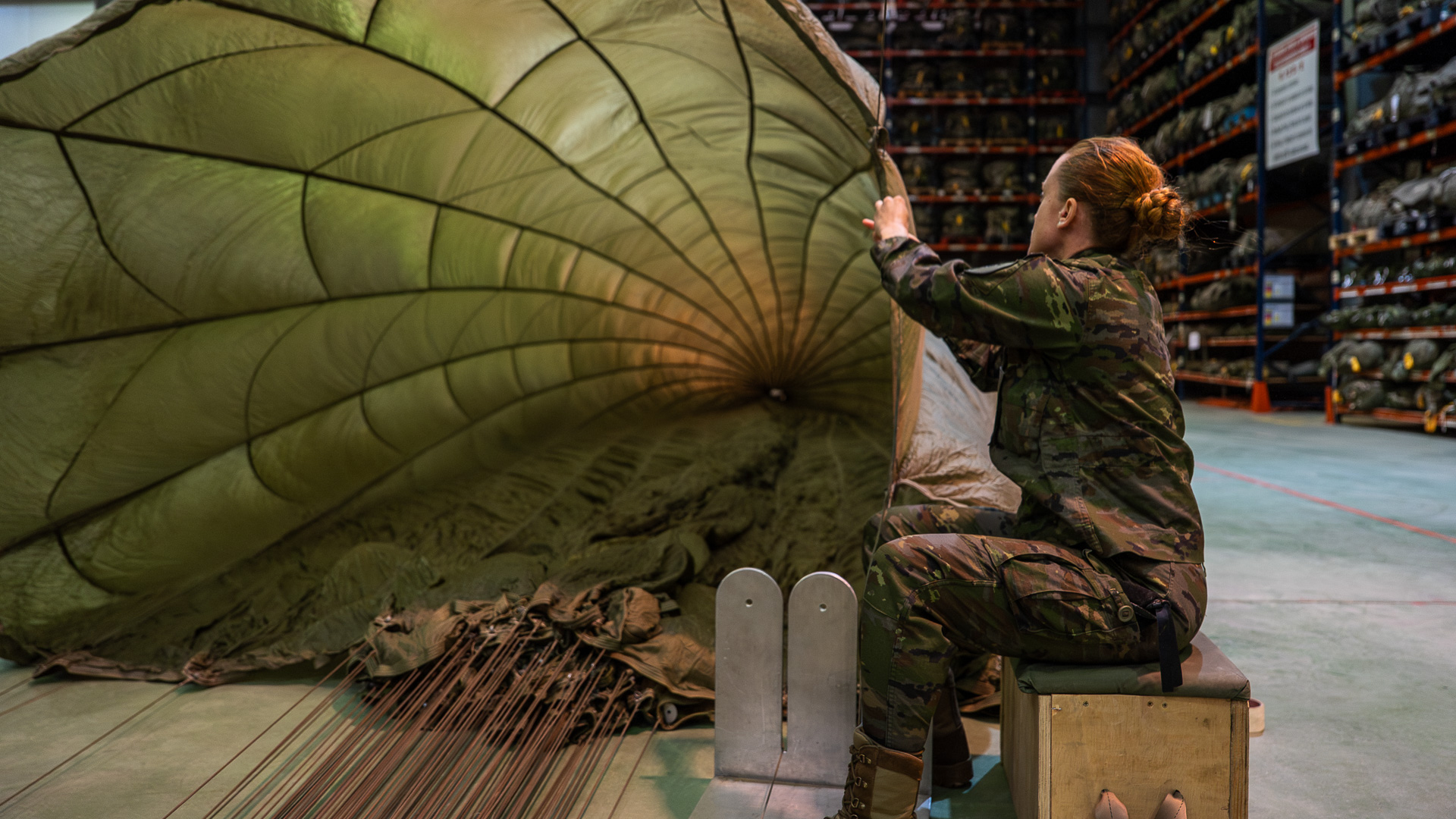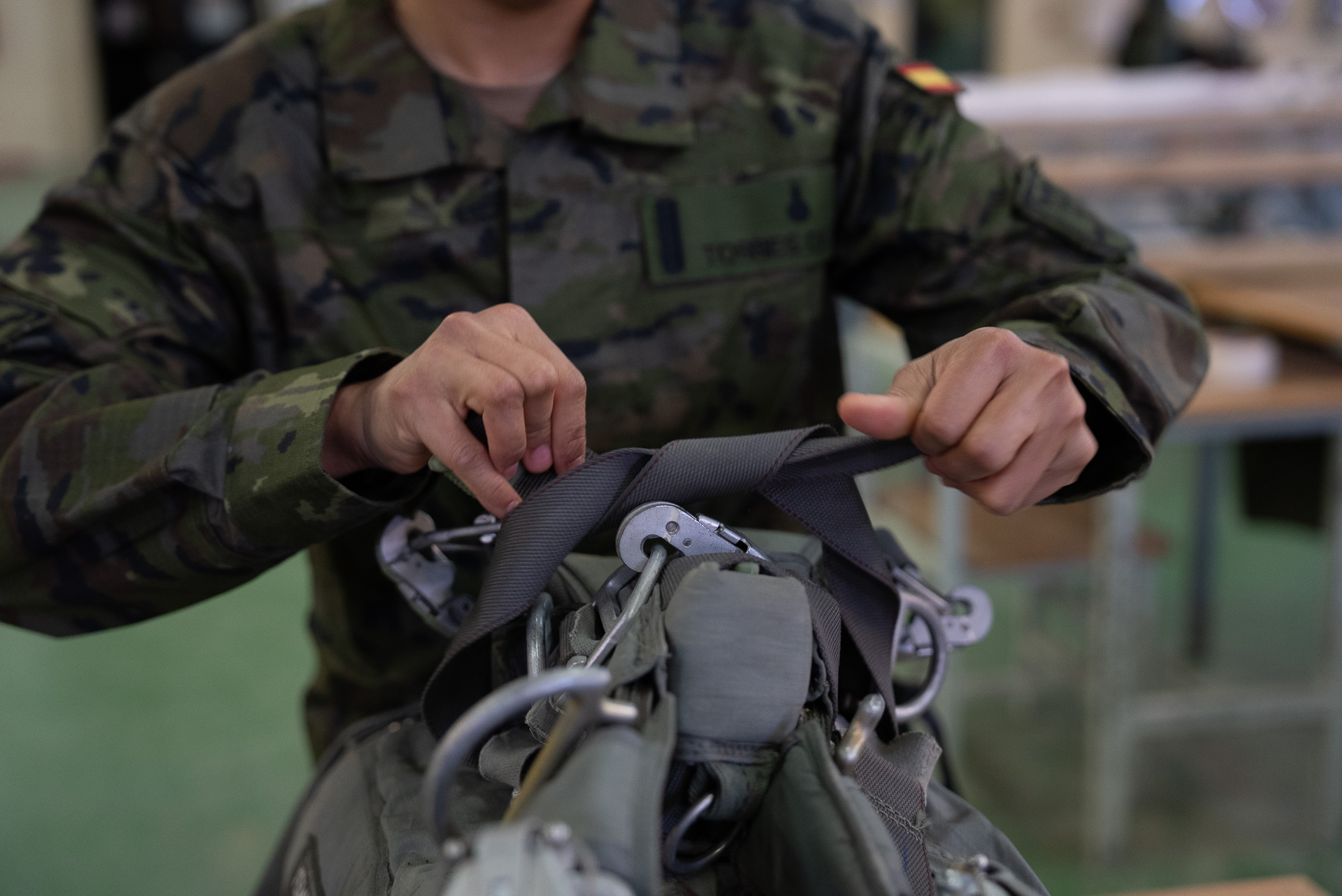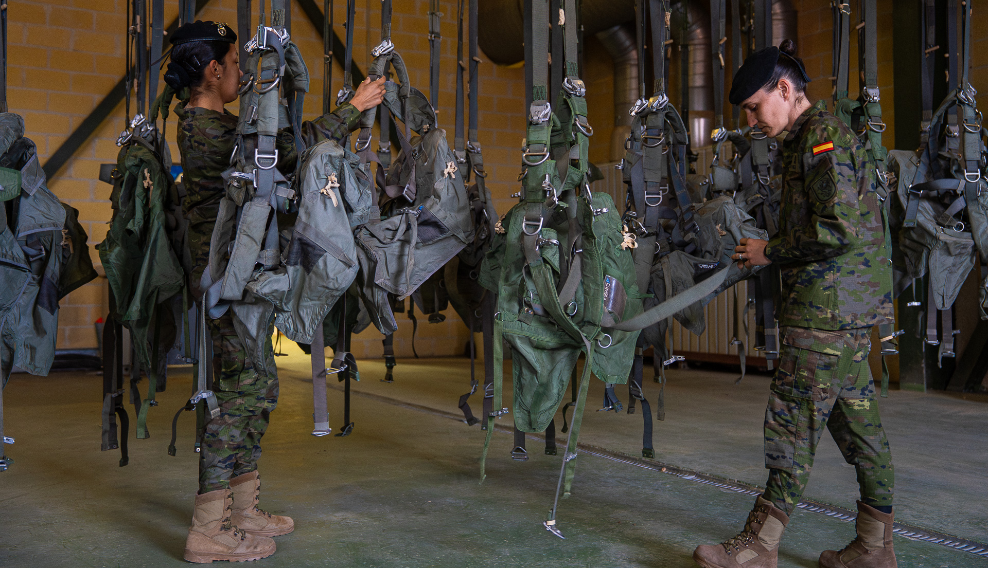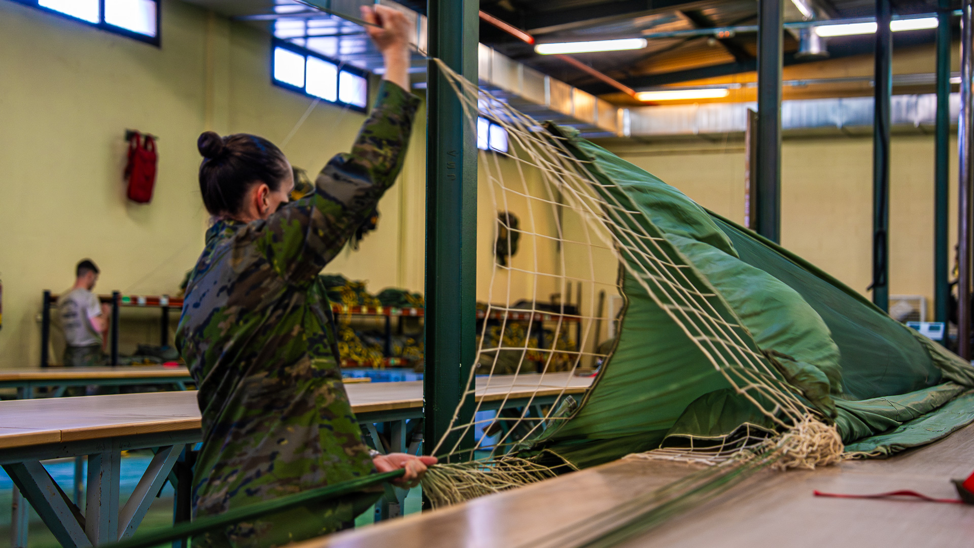 Karla y Leitza pertenecen a la sección de plegado de paracaídas de personal. Son las guardianas de las campanas que llevan los compañeros que saltan. Cada lona de seda que pasa por sus manos es una promesa: la de que, cuando el paracaidista cuente 1.001, 1.002, 1.003, 1.004, el tirón llegará. Leitza llegó aquí porque quería “una unidad operativa”. Le atraía el espíritu de sacrificio, el compañerismo y la posibilidad de “saltar e irte de misión”. Tenía un tío en el Ejército del Aire, pero lo tuvo claro desde el principio: “Quería estar aquí. Es algo para la sociedad, para ayudar a las personas”.