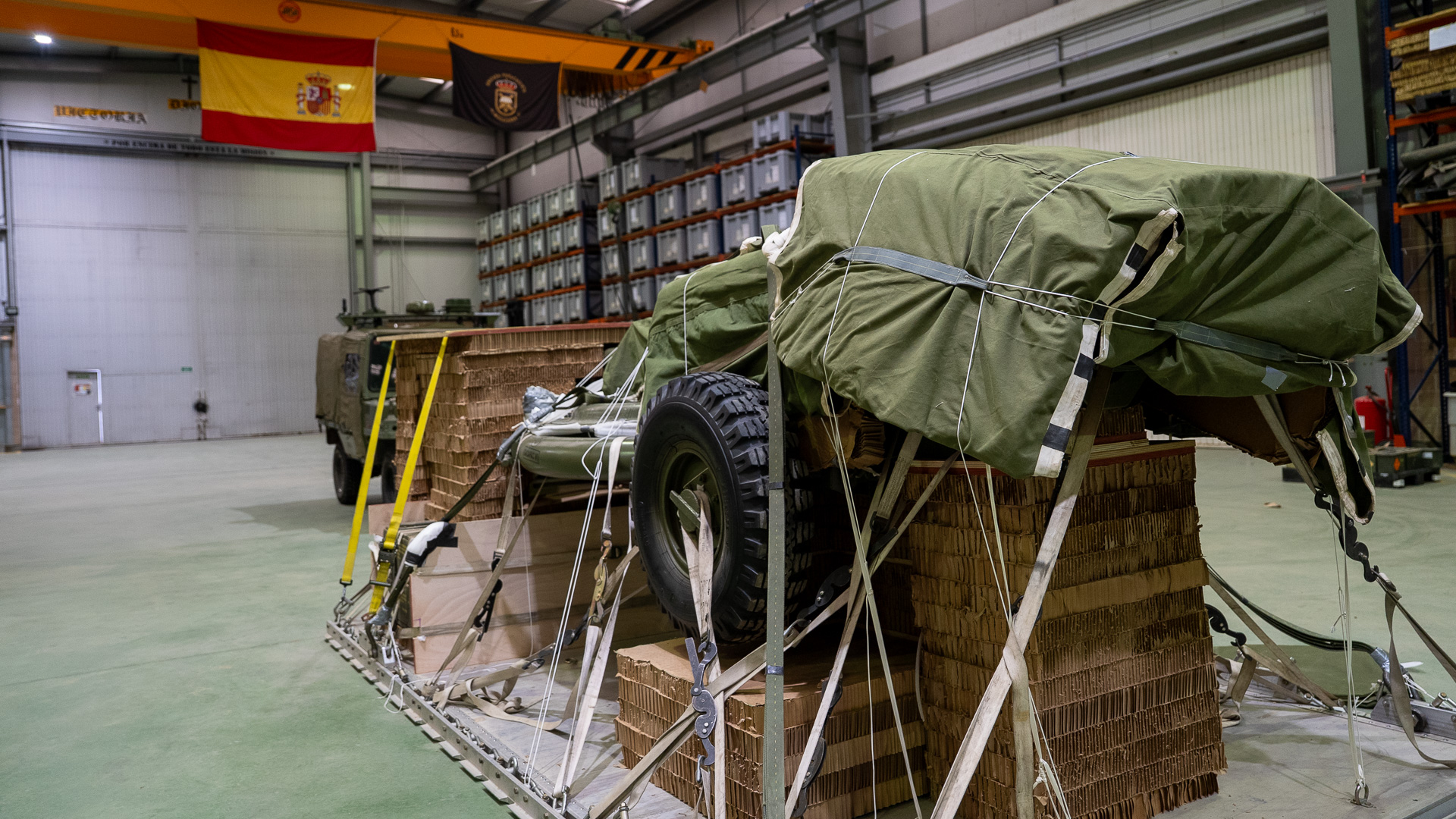 Mientras Karla y Leitza trabajan con paracaídas que sostienen cuerpos, Esther trabaja con paracaídas que sostienen máquinas. En una nave de Torrejón, los paracaídas de carga se extienden como mares de seda. Los vehículos se preparan sobre plataformas cubiertas de disipadores de energía, panales de cartón gigantes que se hunden para amortiguar el impacto y que los equipos cortan a mano, con serrucho. Los cálculos son milimétricos: peso, centro de gravedad, altura, volumen, resistencia. Primero sale un paracaídas de arrastre. Luego la banda de 50 metros. Luego la plataforma entera. Y cuando toca tierra, el vehículo debe quedar listo para arrancar. “Las cargas son palabras mayores”, dicen. Y lo son: un error puede comprometer un avión entero.