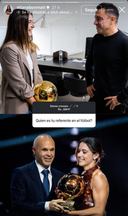 Aitana siempre ha sido muy clara respecto a sus ídolos en el mundo del fútbol. Cuando la preguntaron fue muy sincera, adjuntando fotos de ella junto a Xavi Hernández y Andrés Iniesta, futbolistas a los que ya había expresado su admiración en septiembre cuando ganó su tercer Balón de Oro. “Recibirlo de la mano de Andrés Iniesta, uno de mis ídolos desde pequeña, juntamente con Xavi. He aprendido de ellos mi fútbol de día de hoy, en parte gracias a ello, a todo lo que me enseñaron, y gracias también por todo lo que aportaron en el fútbol”, expresó Bonmatí.
