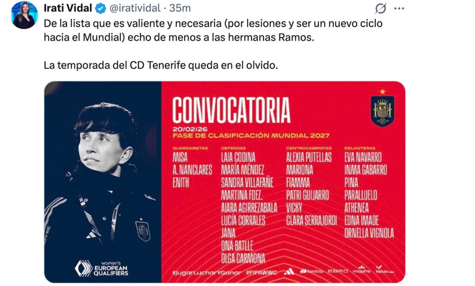 La propia prensa rápidamente fue quien rápidamente se hizo eco de este ‘olvido’. Irati Vidal, Sandra Riquelme, o el siempre cerca del Tenerife Manoj Daswani, se pronunciaban sobre ello. Algunos echaban de menos también a su hermana gemela, Natalia Ramos, con números que llaman también a la puerta de la Roja.