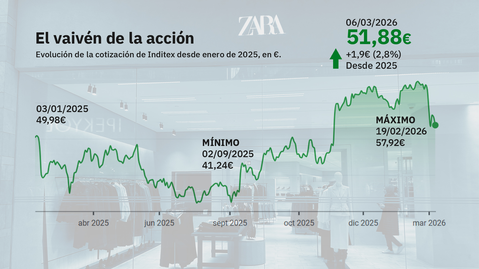 Durante 2026, los títulos de Inditex se han depreciado un 6,39%. Además del beneficio récord registrado en su último ejercicio fiscal, la compañía informó de que sus ventas sumaron 39.864 millones de euros, un 3,2% más sobre 2024. Las ventas a tipo de cambio constante crecieron un 7%, mientras que las ventas ‘online’ crecieron un 4,8%, alcanzando los 10.656 millones de euros. El resultado operativo (Ebitda) creció un 5%, hasta 11.267 millones de euros, y el resultado neto de explotación (Ebit) un 5,9%, hasta 7.997 millones de euros.