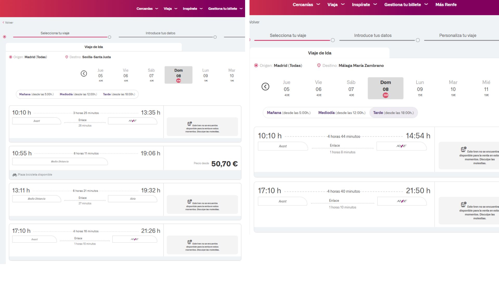 Por su parte, a diferencia de Renfe, Iryo y Ouigo mantenían anoche la venta de billetes de alta velocidad entre Madrid y Sevilla, tal y como pudo comprobar este medio. Iryo tiene programados siete trayectos con una duración de dos horas y 39 minutos. En el caso de Ouigo, cuyos convoyes son dobles, ya ha completado dos trenes y mantiene otros tres disponibles con precios desde 19 euros.