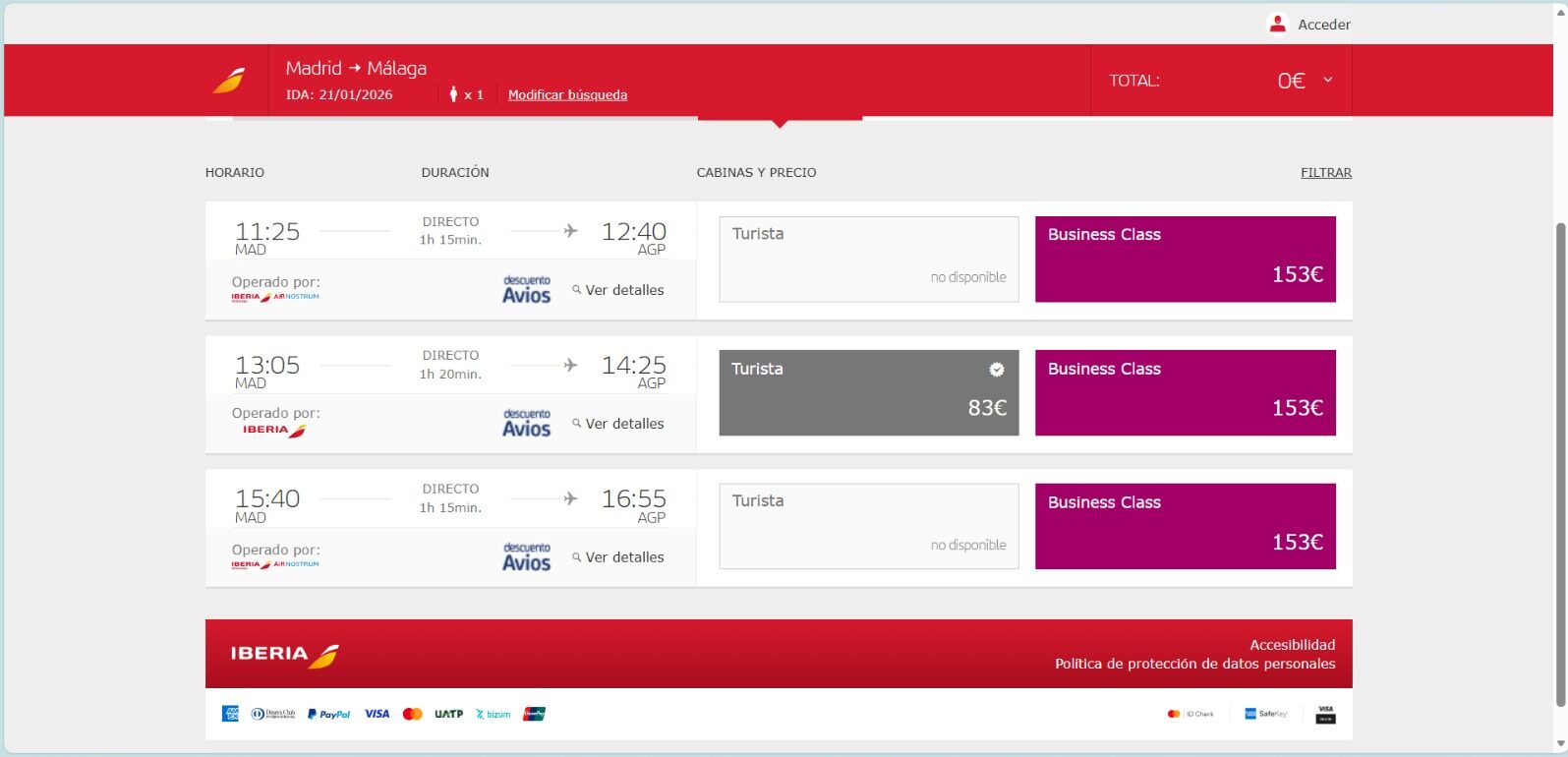 Después de una jornada de confusión, Iberia ha cumplido con el anuncio del martes de fijar un precio máximo por trayecto de 99 euros en clase turista para algunos vuelos entre Madrid y Málaga, 150 euros menos que el lunes. Además, ha programado un vuelo diario más en cada sentido entre Madrid y Sevilla hasta el domingo y otro más en Madrid y Málaga hasta el viernes. Ofrece un 57% más de asientos, hasta un total de 17.340 plazas. El tope de precios se mantendrá como mínimo hasta el lunes 2 de febrero. En clase turista, hemos podido reservar un vuelo por 83 euros. De haber escogido Business Class, 153 euros.