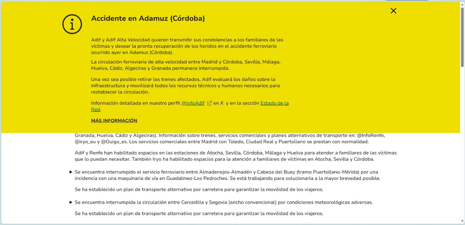 El descarrilamiento obligó a suspender de inmediato el servicio de tren de alta velocidad entre Madrid y Málaga, ni con Renfe ni con otros operadores como Iryo u Ouigo. Los viajeros con billetes para ese día vieron cancelados o modificados sus trayectos sin coste adicional y se habilitaron cambios y anulaciones gratuitas.