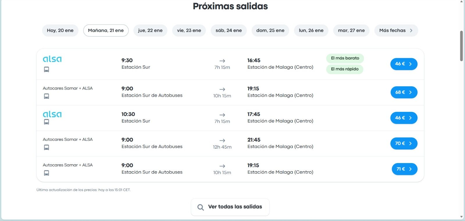Aunque sus tarifas también subieron en las primeras horas después del descarrilamiento en Adamuz, el impacto de la ley de la oferta y la demanda extrema ha sido menor. El trayecto es largo, unas seis o siete horas, pero es una opción realista mientras el tren no esté operativo.