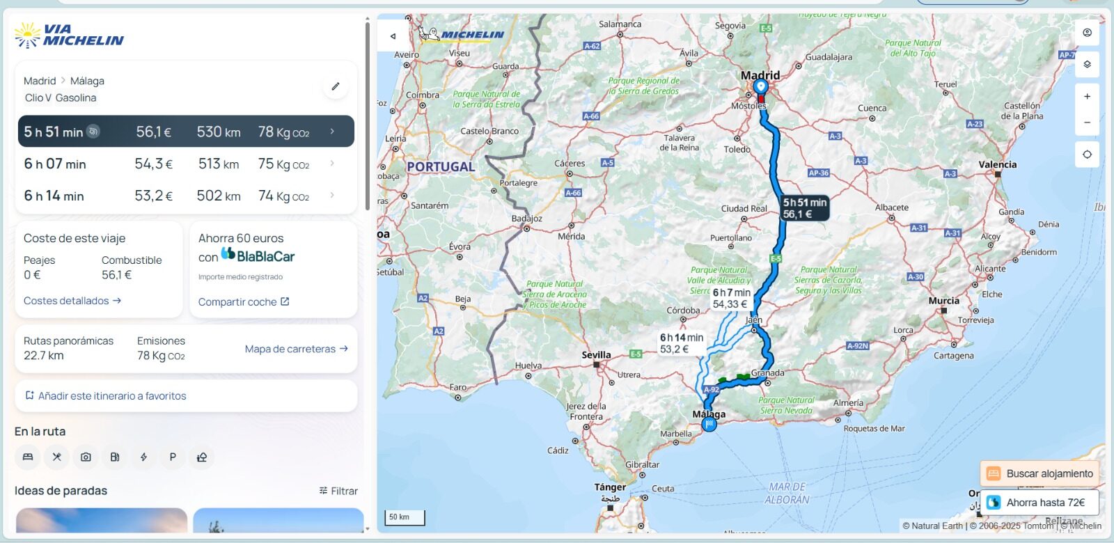 La opción del coche nos saldría por 56,1 euros. No hay peajes obligatorios por la ruta principal (A-4, A-45), que es una autovía gratuita, por lo que no habría que añadir el coste de peajes. En medio de esta situación compleja, muchos viajeros están usando plataformas de coche compartido dado el caos actual. Suele costar entre 25 y 55 euros por persona, dependiendo del conductor y el horario. Alquilar coche por 24 horas podría costar de 380 a 1.000 euros según empresa y fianza.