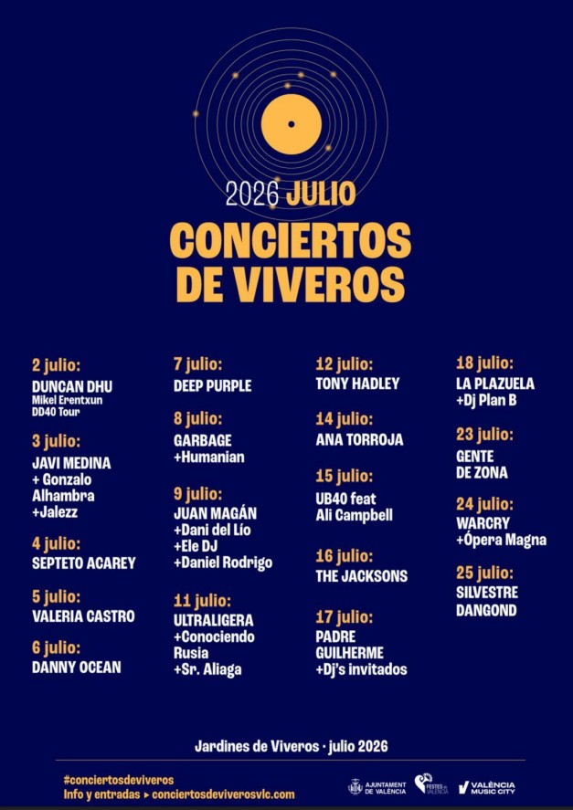 Este julio de 2026, vuelven los Conciertos de Viveros en los grandes jardines de la ciudad de Valencia. Esta edición destaca por ser la más amplia hasta la fecha, con una notable variedad en los artistas (locales, nacionales e internacionales) y el apoyo al talento y la empresa de la Comunidad.