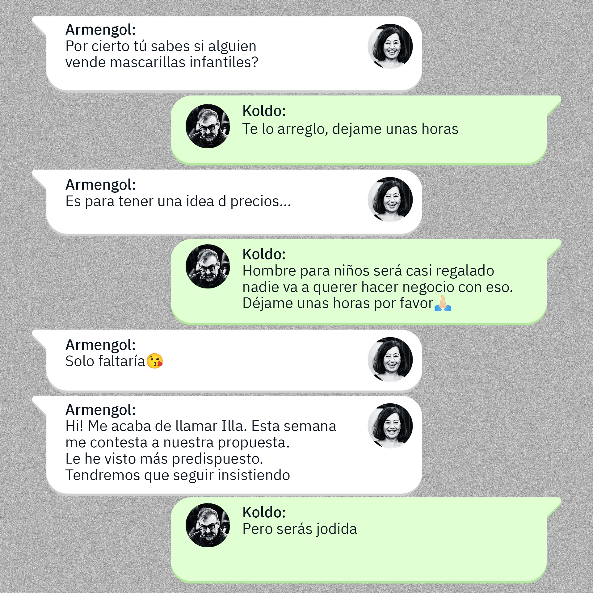 A las dos horas, le contestó Koldo García: “Presidenta perdone que le moleste tardarían 7 días. El coste es lo que venden, no quieren beneficio en eso. Pueden conseguir un avión ya si quieres hablo con Manuel”. Se refería al Director de Gestión del Servicio de Salud de Balares, Manuel Palomino.