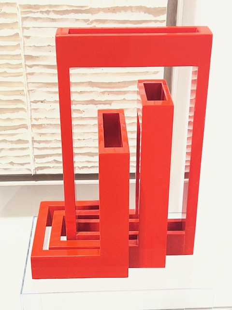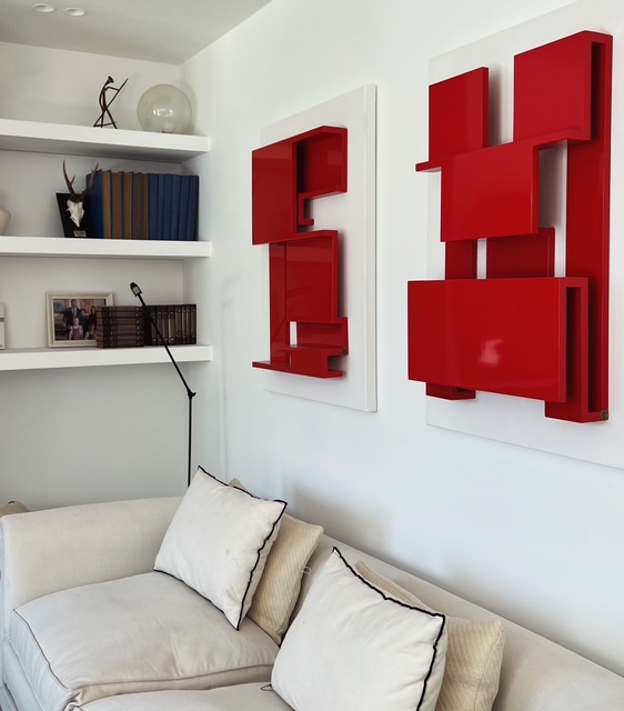 Aunque muchas de sus piezas nacen todavía desde el plano, su trabajo ha ido desplazándose cada vez más hacia lo escultórico. De hecho, la propia artista insiste en que no se siente pintora, sino escultora; alguien que trabaja con las manos para extraer volumen de la superficie. Esa pulsión le ha llevado a desarrollar una nueva línea de obra en madera, con relieves anclados sobre lienzo y estructuras construidas a partir de múltiples piezas ensambladas. Son composiciones que parten de la simetría, de los ángulos rectos y de una observación atenta de la arquitectura, especialmente de los edificios y de los elementos espaciales que forman parte del universo del interiorismo.