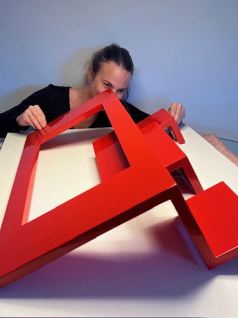 En estas obras más recientes, el proceso se vuelve todavía más físico y exigente. Cada escultura puede componerse de entre 18 y 20 piezas y requerir meses de trabajo, no tanto por su ejecución material como por el tiempo necesario para encontrar la forma definitiva. Antes de pasar a la madera, Adriana desarrolla la idea en otro soporte que funciona como base o boceto tridimensional; allí prueba proporciones, ajusta tensiones y decide la estructura final. Después llega el trabajo de corte, ensamblaje y construcción en el estudio. El resultado son piezas de presencia rotunda, algunas de gran peso visual y material, que expanden su lenguaje sin romper con la raíz de su investigación inicial.