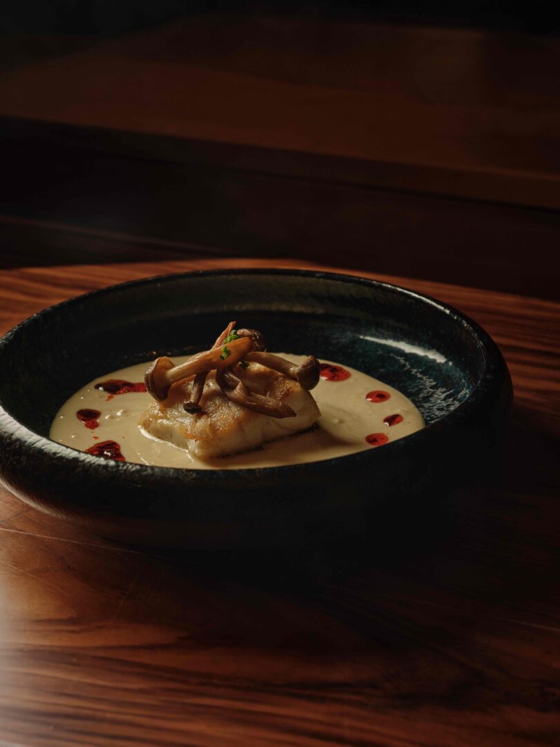El centro del menú refuerza ese juego entre precisión y energía: sashimi de salmón con salsa yakinuki y ají, aonori y furikake; y una tostada de atún (akami marinado en miso con trufa sobre chip negro de arroz, aderezo de miel y crujiente de poro). Los calientes cierran el arco del “fuego” con más claridad: gyozas de wagyu sobre salsa de jamaica y reducción de soya con morita y chile japonés; brocheta de pork belly estilo char siu, cocinada ocho horas y terminada con un glaze de cinco especias; y una lubina miso mantequilla con aceite de chiles. Además, quien quiera empujar un poco más la experiencia puede añadir un plato extra de wagyu. El final remata con un tiramisú de matcha.