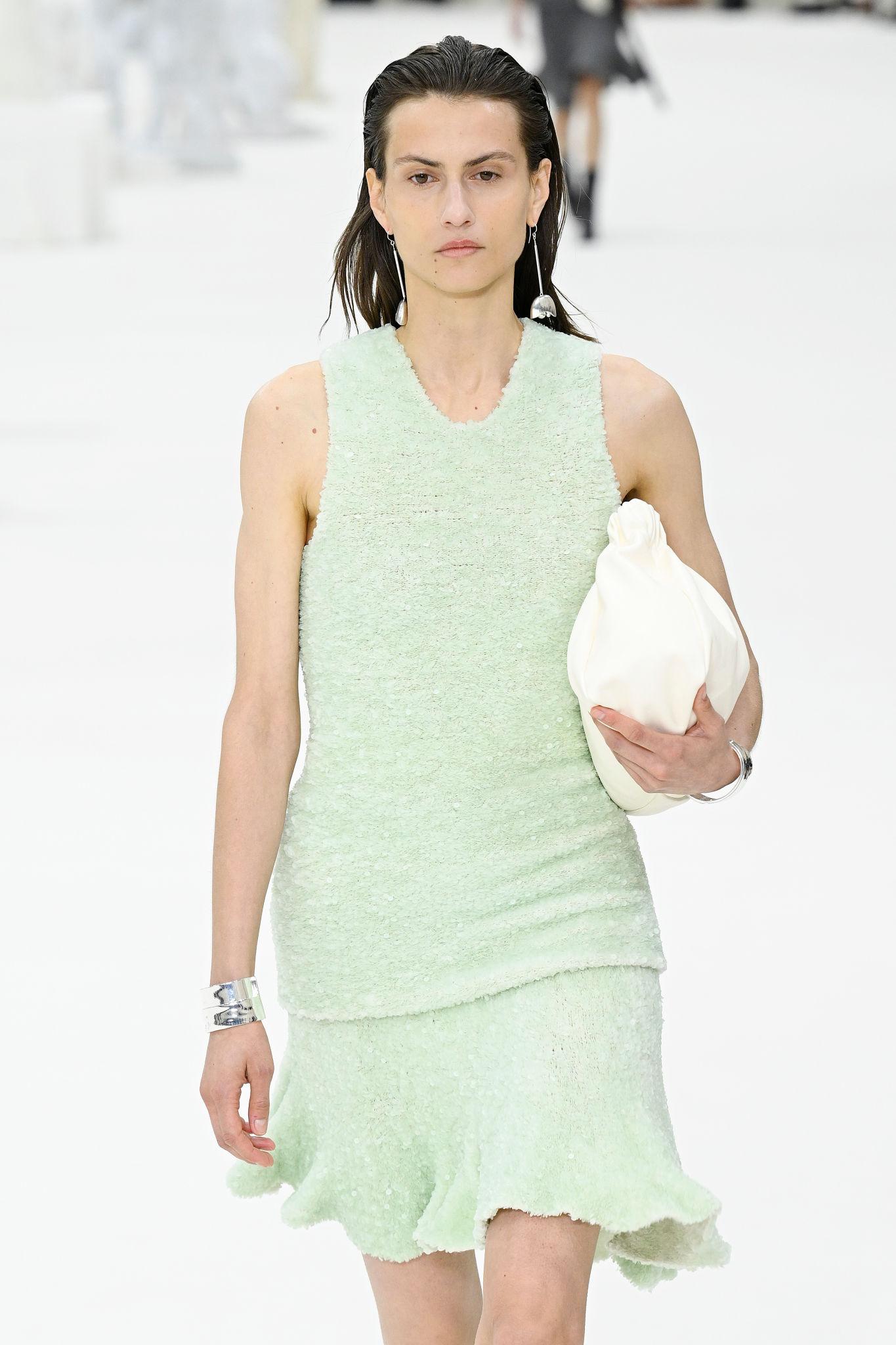 Bajo su leit motiv en la casa italiana, su narrativa cromática conjuga a la perfección con los valores que la directora creativa aplica a diario (ropa que “te haga sentir mejor” y te ayude a “vivir mejor en ella”) y que, automáticamente, le confieren cualidades de tranquilidad, frescura, limpieza y creatividad. Así lo confirmó su propuesta conjunta con Raf Simons para Prada P/V 26, donde reinaron las siluetas de faldas y vestidos abiertos a modo de pichi, sumada a las siluetas vistas en Fendi, Dior o Calvin Klein, que apostaron por tejidos satinados y piezas en looks completos como trajes y blazers.