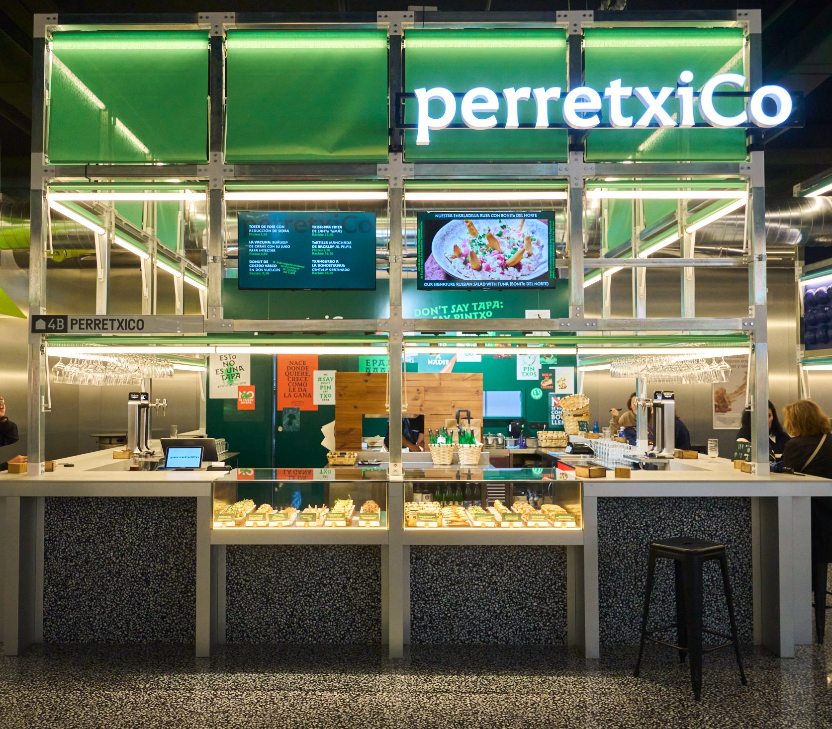 R – Este es uno de esos ejercicios de innovación que han dado muchos dolores de cabeza al equipo. Por un lado, es la oportunidad perfecta para cumplir con ese propósito interno de ser embajadores de nuestra cocina y tierra; ten en cuenta que tan solo un 37 % de las afluencias en ese punto son nacionales, pero por otro ha supuesto el reto de adaptarnos a un espacio y dinámica de terceros. Ha sido difícil, pero estamos muy contentos. perretxiCo Bernabéu es un escaparate de nuestras barras al mundo, un primer punto interesante para empezar el viaje que proponemos y cobra vida de manera singular en cada taberna.