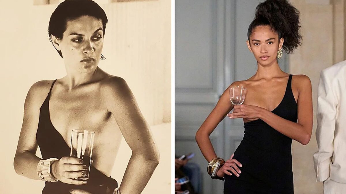El momento más comentado del desfile llegó con el último look, concebido como un homenaje directo a Paloma Picasso, hija del pintor. La silueta se inspiró en una icónica fotografía tomada por Helmut Newton en Saint-Tropez en 1973, donde Paloma aparece con un vestido asimétrico y una copa de pie cubriendo el pecho. Esta referencia, reinterpretada por Jacquemus, cerró el desfile como una conversación visual entre arte, moda e historia, bajo la sombra tutelar de Pablo Picasso.