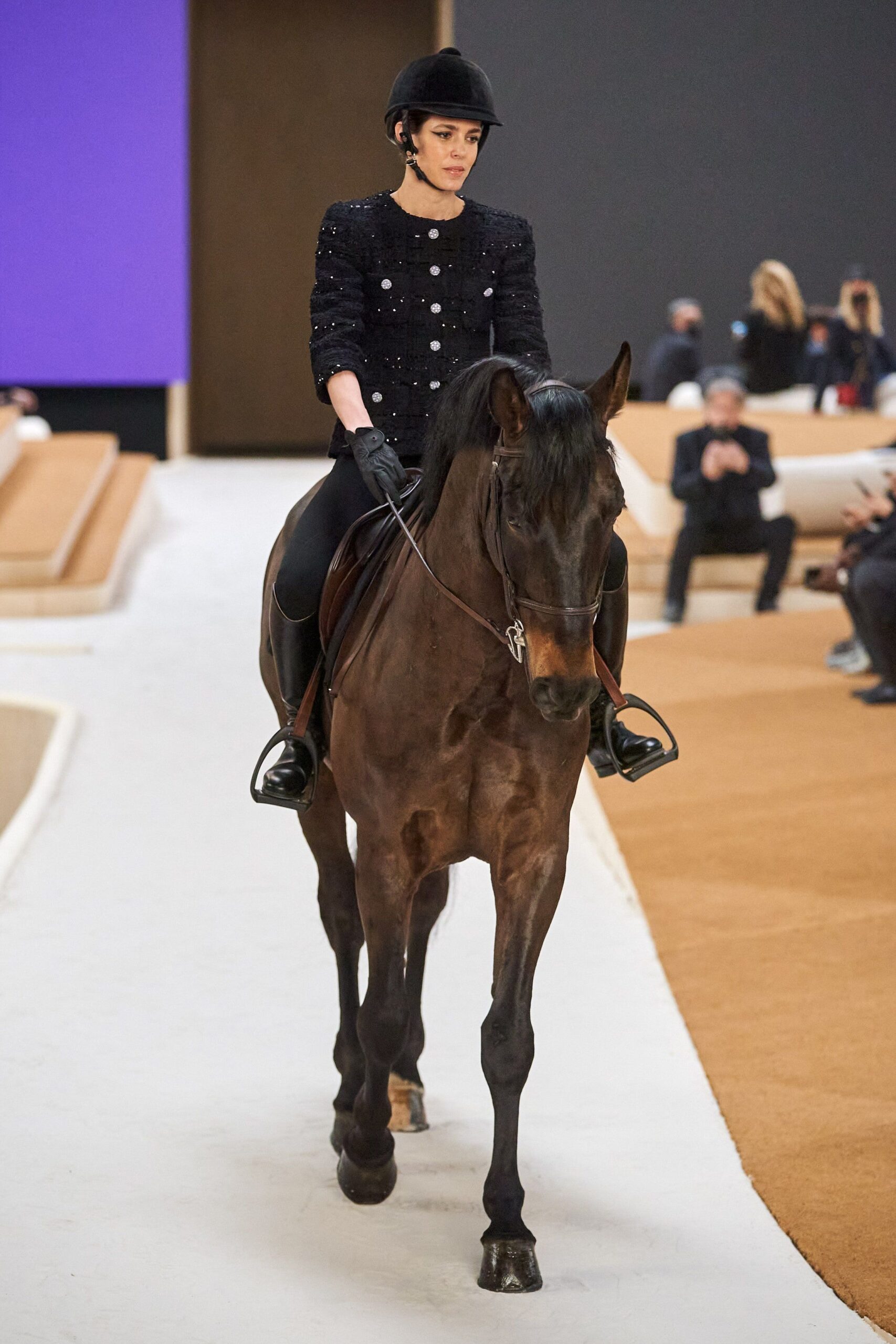 La chaqueta negra de tweed con lentejuelas, las botas de montar, el casco ecuestre… Nada sobraba. La chaqueta era, por supuesto, el centro de gravedad del estilismo. La chaqueta de tweed era, por supuesto, el eje de todo el estilismo. Chanel lleva décadas volviendo una y otra vez sobre esa pieza, pero aquí aparecía traducida a una versión más firme, más seca, menos ornamental.
