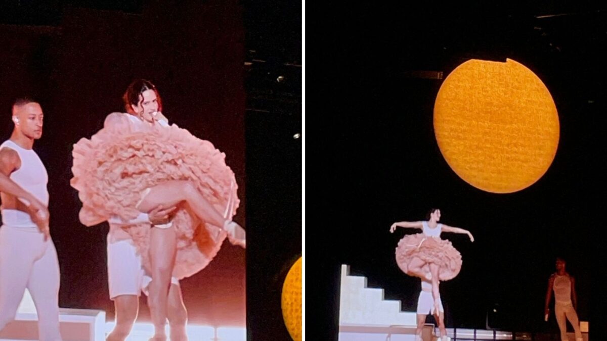 En el primer acto, apareció con un tutú rosado de volantes, corpiño de satén y zapatillas de punta. Una imagen de bailarina clásica, casi escultórica, que remite directamente a las figuras de Edgar Degas. Ejecutó esta primera parte de puntillas. El cuerpo disciplinado, etéreo, y la belleza en tensión.