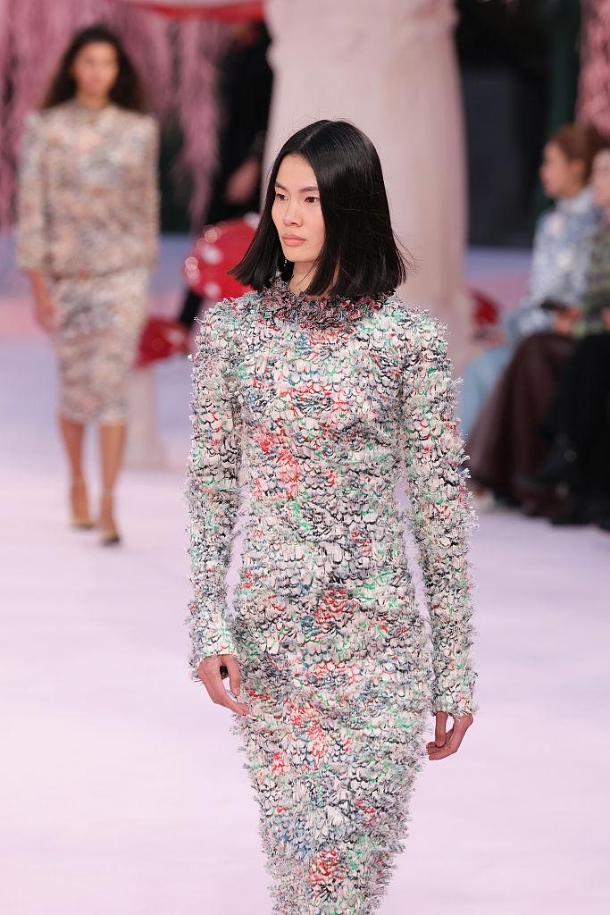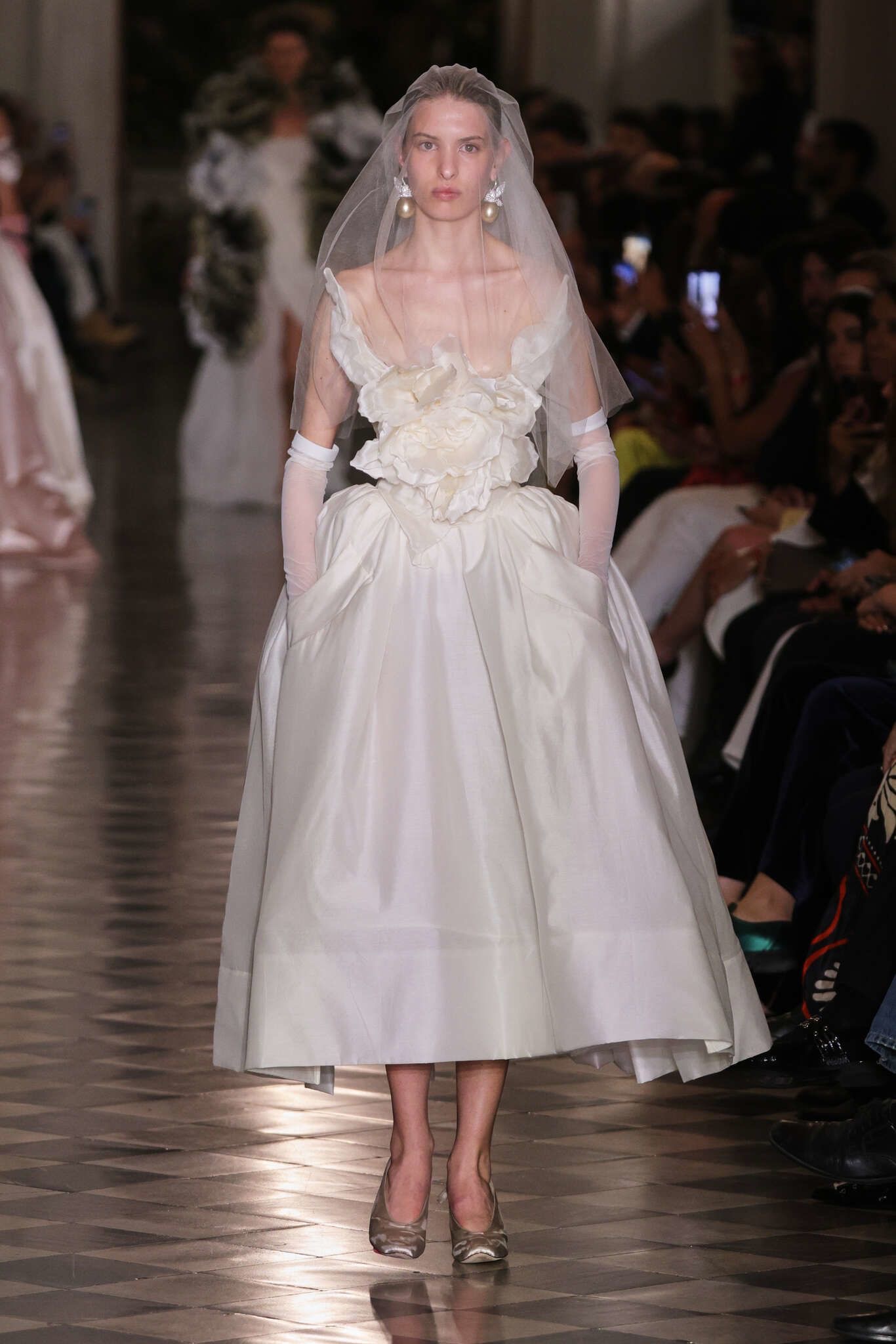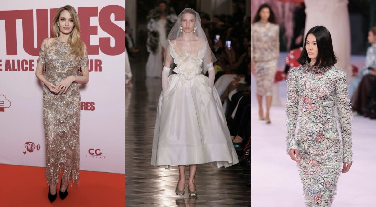 En esta línea, brocados florales, jacquards y bordados tridimensionales confirman que el relieve ha vuelto (también) a las estructuras de los vestidos. Históricamente vinculado a la nobleza europea, el brocado vuelve reinterpretado en clave contemporánea, acompañado de transparencias, brillos y cortes singulares en clave bridal. Algo que, en vrai, se traduce en vestidos parecen esculpidos sobre el cuerpo y donde abundan tanto las flores en relieve como las aplicaciones, pero también en tweed abundante y lino evidente, que generan sombras y volumen. En resumen: el tejido deja de ser fondo para convertirse en protagonista absoluto por sí mismo.