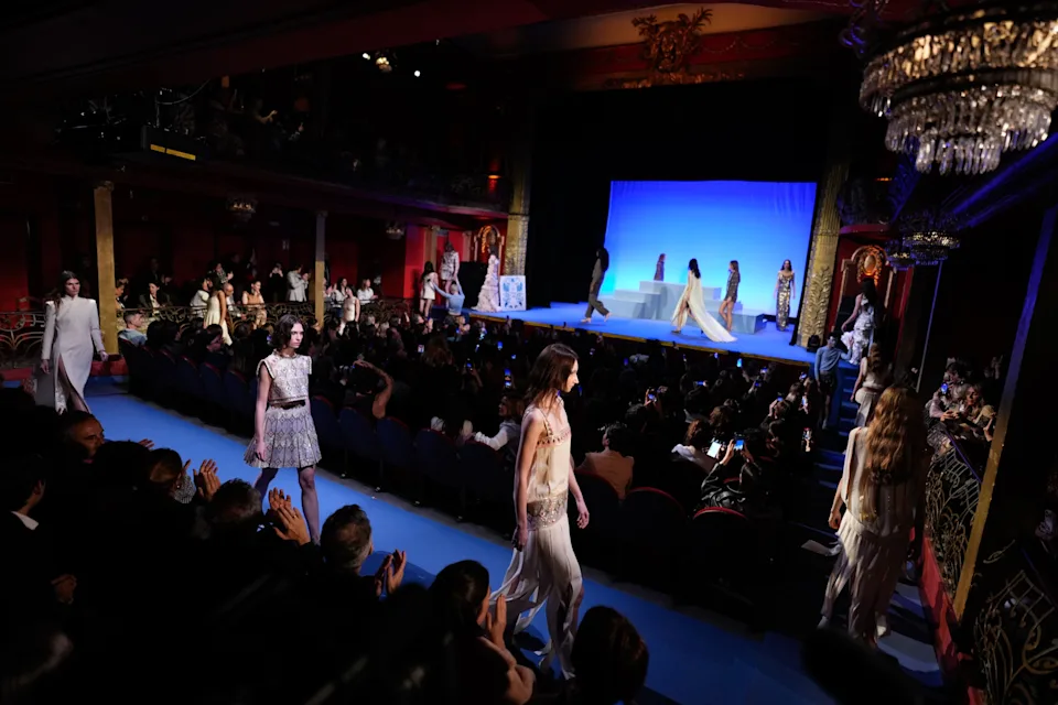 Ahí estuvo una de las mayores virtudes del desfile. La colección respiró ligereza, sí, pero no blandura. Los tejidos parecían suspendidos en el aire y, al mismo tiempo, cada salida revelaba estructura, horas de taller y control del detalle. La propuesta transitaba entre el día y la noche, con referencias al cisne bordadas en vestidos y chaquetas, minilazos azules, vestidos de raso serigrafiados, capas de tul, volantes en gasa y una gama cromática que iba del azul grisáceo al rosa y al crudo del amanecer. Más que un repertorio de recursos, fue una declaración de método: convertir lo frágil en algo sólido a través de la mano.