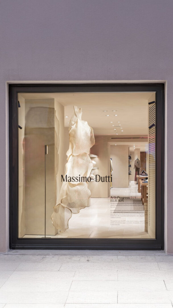 Pero todavía hay más. Porque esta boutique no es un simple contenedor, sino un espacio que respira arte. Art in Progress, la iniciativa con la que Massimo Dutti transforma sus tiendas en galerías, suma un nuevo capítulo con ELIURPI, el dúo catalán que diseña sombreros como si esculpiera pensamientos.