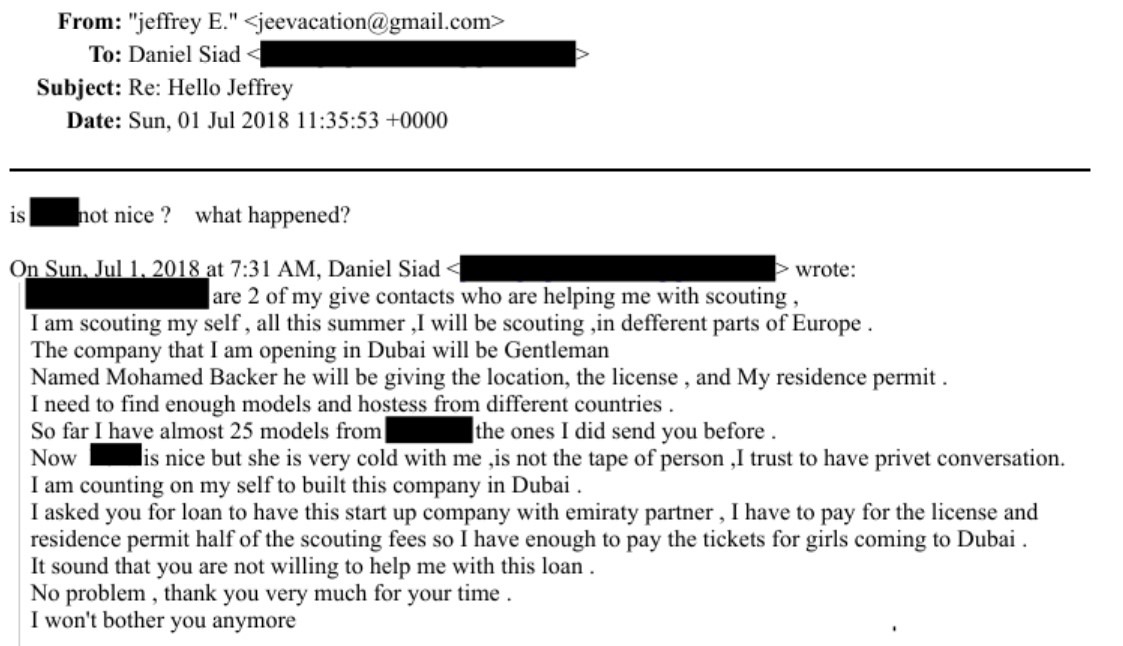Los documentos desclasificados sitúan a Siad en contacto regular con Epstein entre 2009 y 2019. En los intercambios figuran mensajes como “Ella tiene 26 años pero aparenta 18” y “Tengo seis chicas que pueden viajar hasta París”, además de registros de pagos por decenas de miles de euros hacia distintas cuentas vinculadas a él, incluidas algunas en Tailandia y Dubái. Hasta ahora, no ha sido interrogado por la justicia francesa.