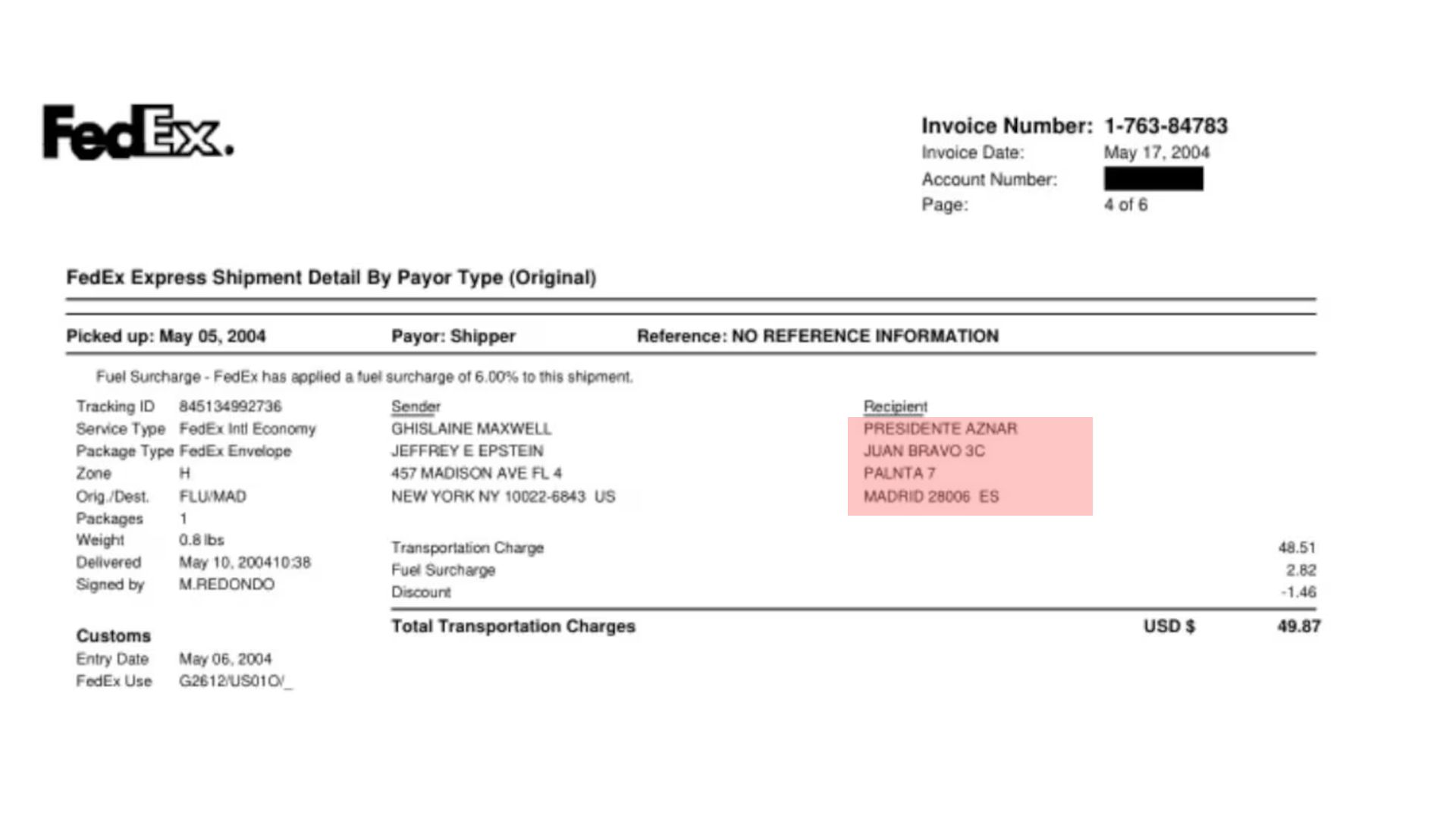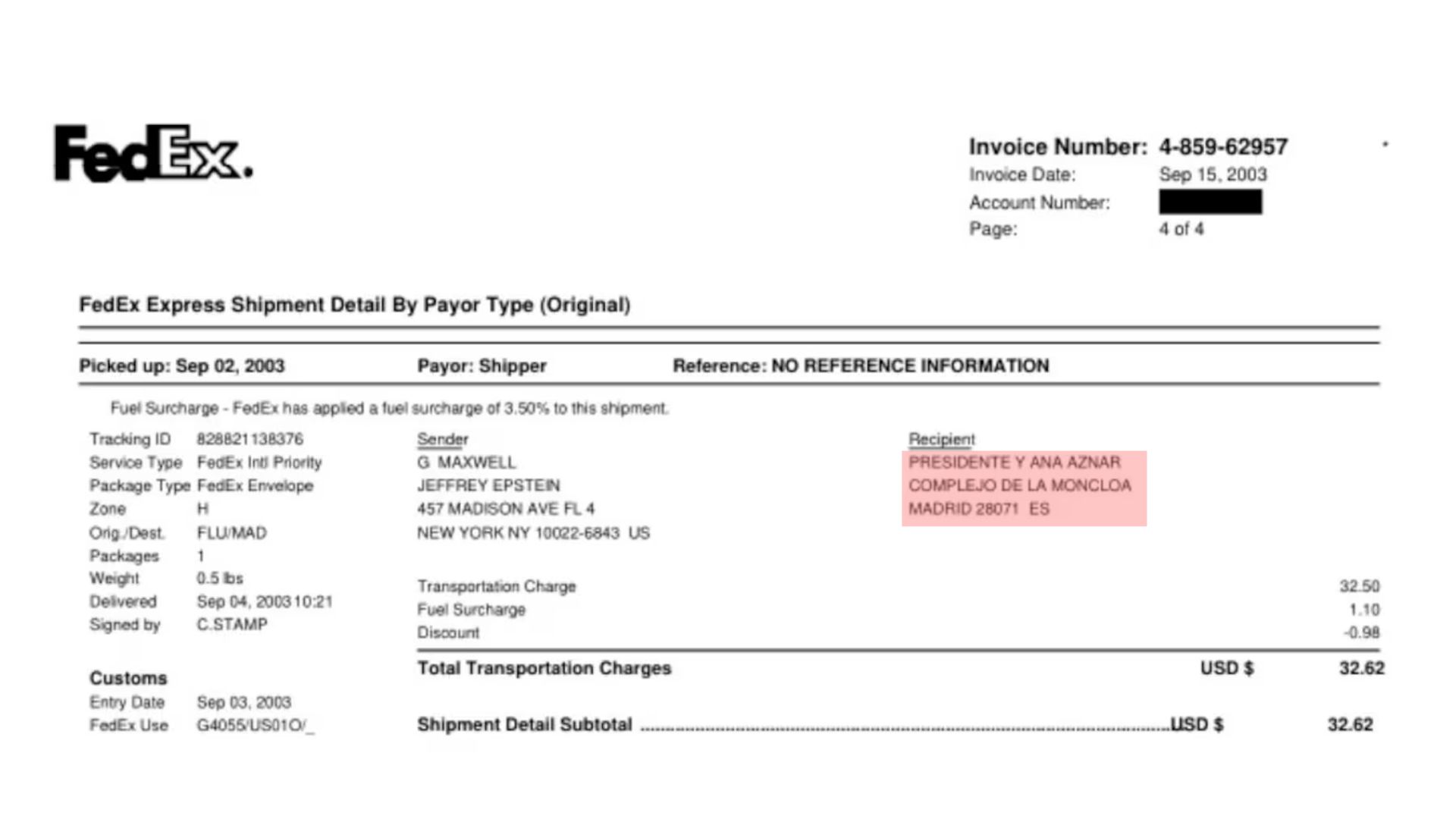 El coste de aquel envío ascendió a 32,62 dólares y se hizo a través del servicio de mensajería Fedex desde la sede de las oficinas de Epstein en Nueva York hasta el Palacio de la Moncloa en Madrid con el encabezado “Presidente y Ana Aznar”.