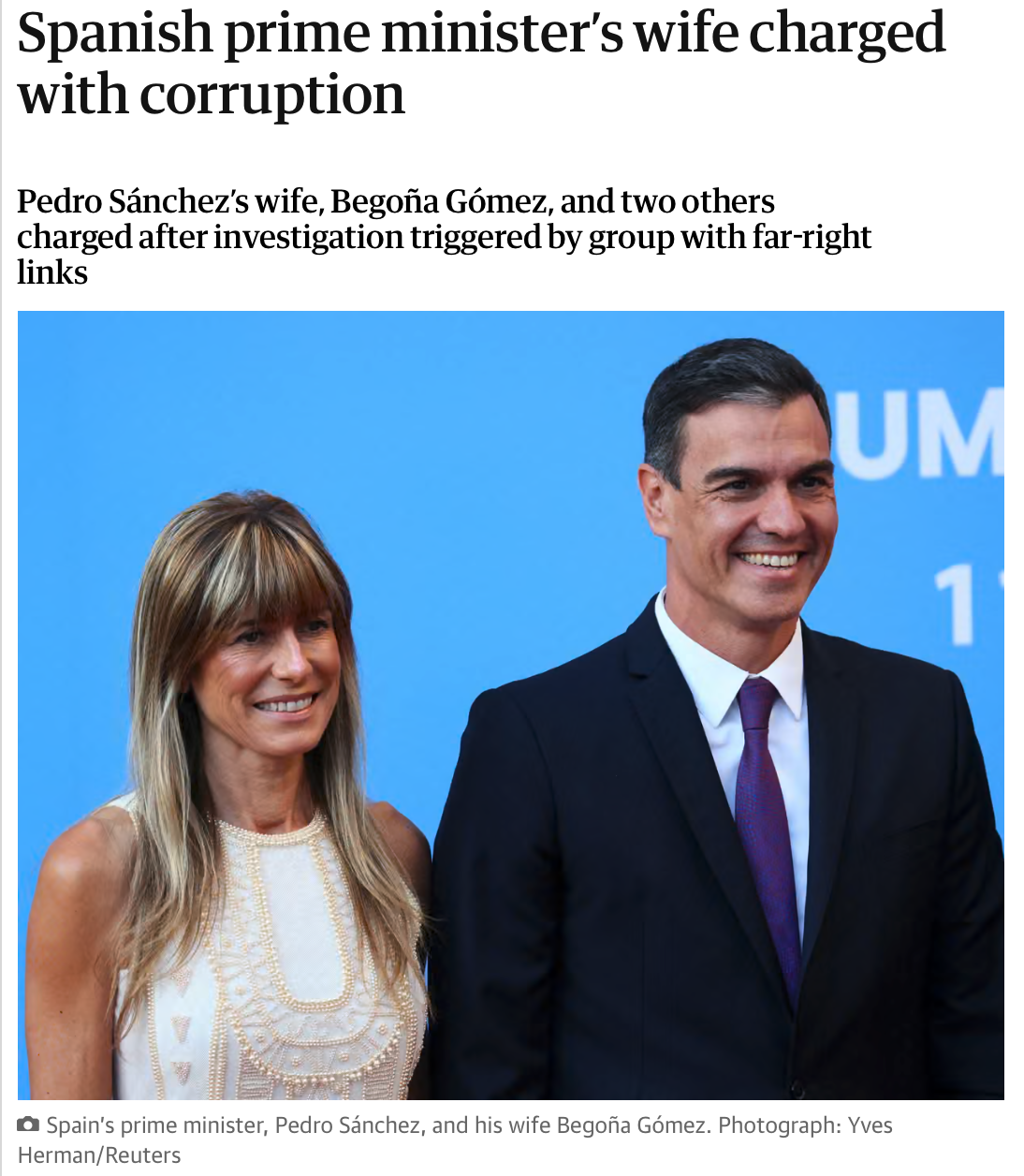 Destaca la homogeneidad en los titulares. Medios como France 24, Deutsche Welle o BBC optan por fórmulas prácticamente idénticas: “la esposa del presidente español, imputada por corrupción”. En el caso de France 24, el titular añade un matiz temporal -“tras años de investigación”-, mientras que la BBC habla de una “investigación de dos años”.
