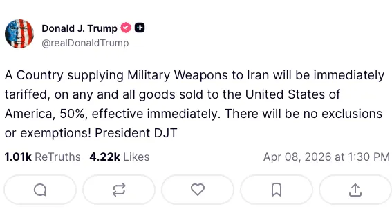 "El país que suministre armas militares a Irán será inmediatamente gravado con un arancel del 50 % sobre todos y cada uno de los bienes vendidos a EEUU con efecto inmediato. ¡No habrá exclusiones ni exenciones", alegó Trump en su red social Truth Social.