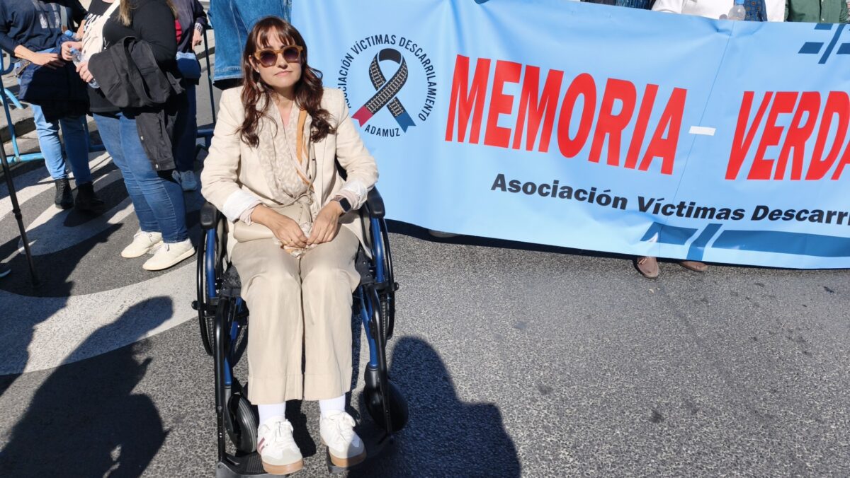 María Eugenia acudió a la manifestación en silla de ruedas y espera volver a caminar en unas semanas. Tiene tres fracturas de pelvis y heridas corporales. Le arropó su familia, pero no estuvo su marido, que es uno de los 46 fallecidos en el descarrilamiento.
