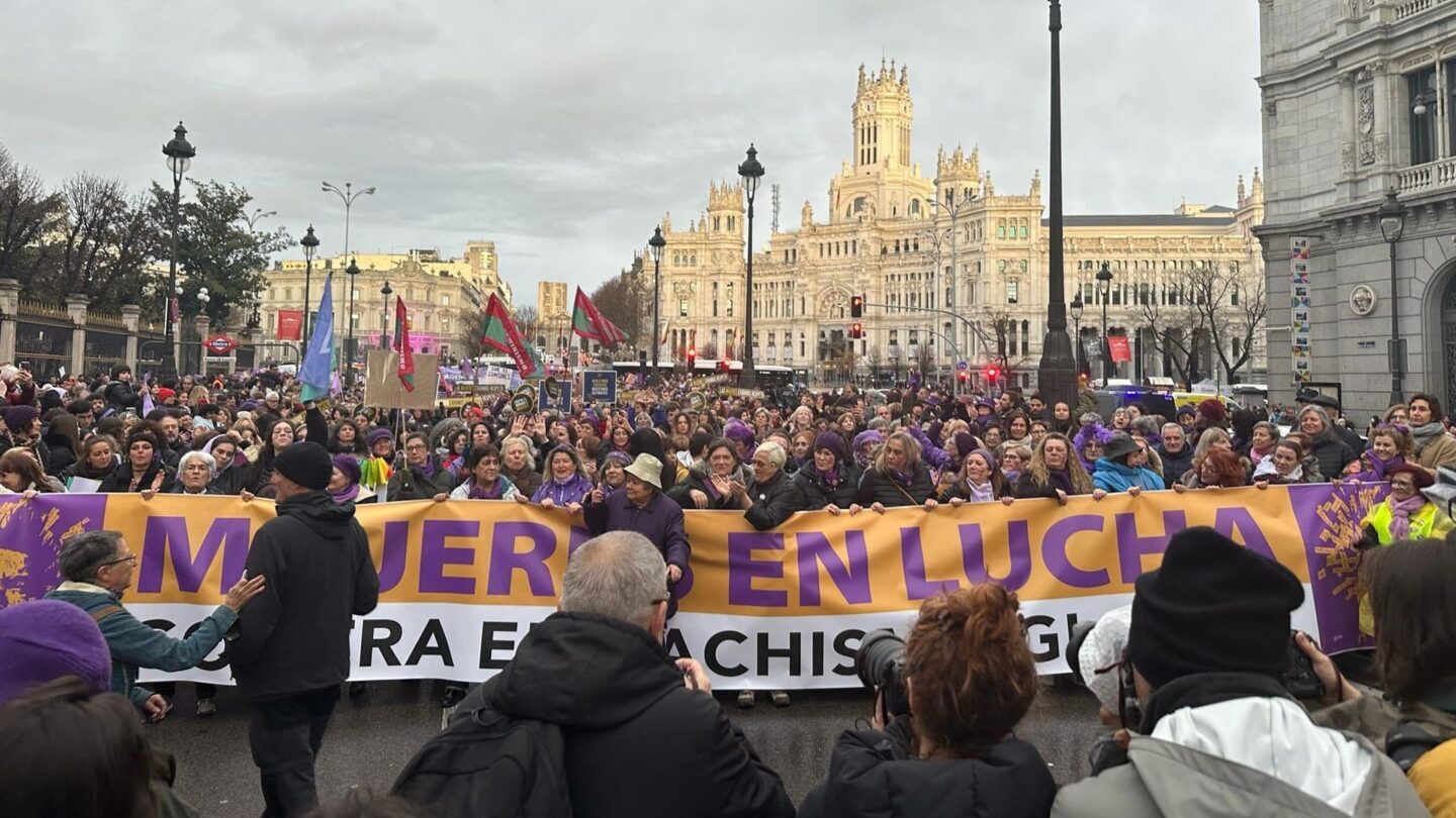 La “barbarie patriarcal adopta la forma de guerras, genocidios y regímenes de apartheid contra mujeres y niñas, además de la violencia en los hogares”, proclama el Movimiento Feminista de Madrid, que ha convocado su marcha entre la Gran Vía hasta Plaza de España, y que pretende que el 8M sea un altavoz por la abolición de la prostitución.