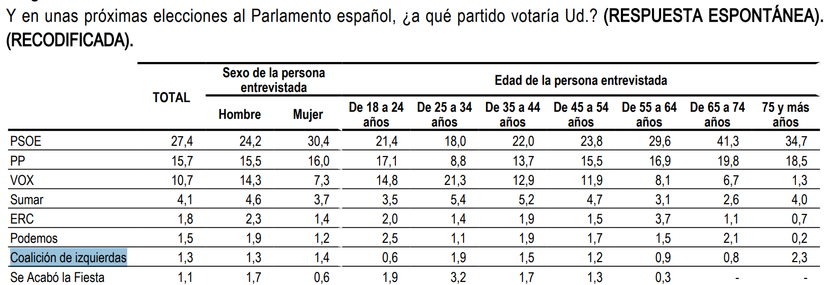 En concreto, aparece después de que el CIS plantee esta cuestión: “En unas próximas elecciones al Parlamento español, ¿a qué partido votaría Ud.?” Un experto demoscópico consultado por Artículo14 responde así ante la súbita aparición de esta respuesta “espontánea” (según el CIS): “Desde luego la gente no responde directamente coalición de izquierdas”.