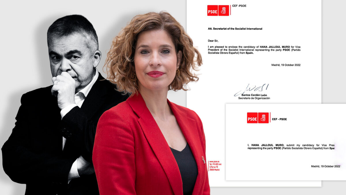 “Estoy encantado de adjuntar la candidatura de Hana Jalloul Muro como vicepresidenta de la Internacional Socialista representando al Partido Socialista Obrero Español (PSOE) de España”. Firmado: Santos Cerdán León. Así propuso el exsecretario de Organización del partido a Jalloul el 19 de octubre de 2022, según muestra una carta a la que ha accedido Artículo14. El 25 de noviembre de 2022 Pedro Sánchez fue elegido presidente de la Internacional Socialista (IS) y la abogada y política ghanesa Benedicta Lasi, secretaria general.