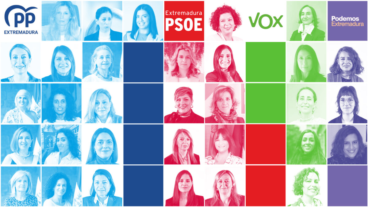 En lo que respecta a las diferentes formaciones, el PP aporta 15 parlamentarias, el PSOE nueve, Vox cinco y Unidas por Extremadura tres. A nivel porcentual, los dos primeros partidos superan o igualan el 50% de representación femenina entre sus filas.
