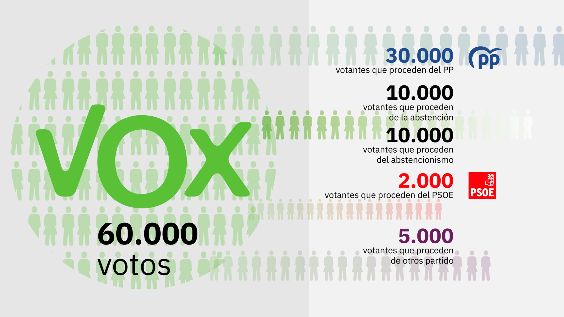 En este resultado fue clave la elevada retención de sus votantes de 2023, que el CIS estimó en un 75% y que el instituto Opina360 sitúa incluso algo por encima, en torno al 80%. Esta fidelidad significa que 60.000 de sus votantes repitieron la papeleta de Vox y el resto (casi los mismos, unos 57.000) fueron prestados o, dicho de otra, se subió a la ola creciente que empuja a los de Abascal.