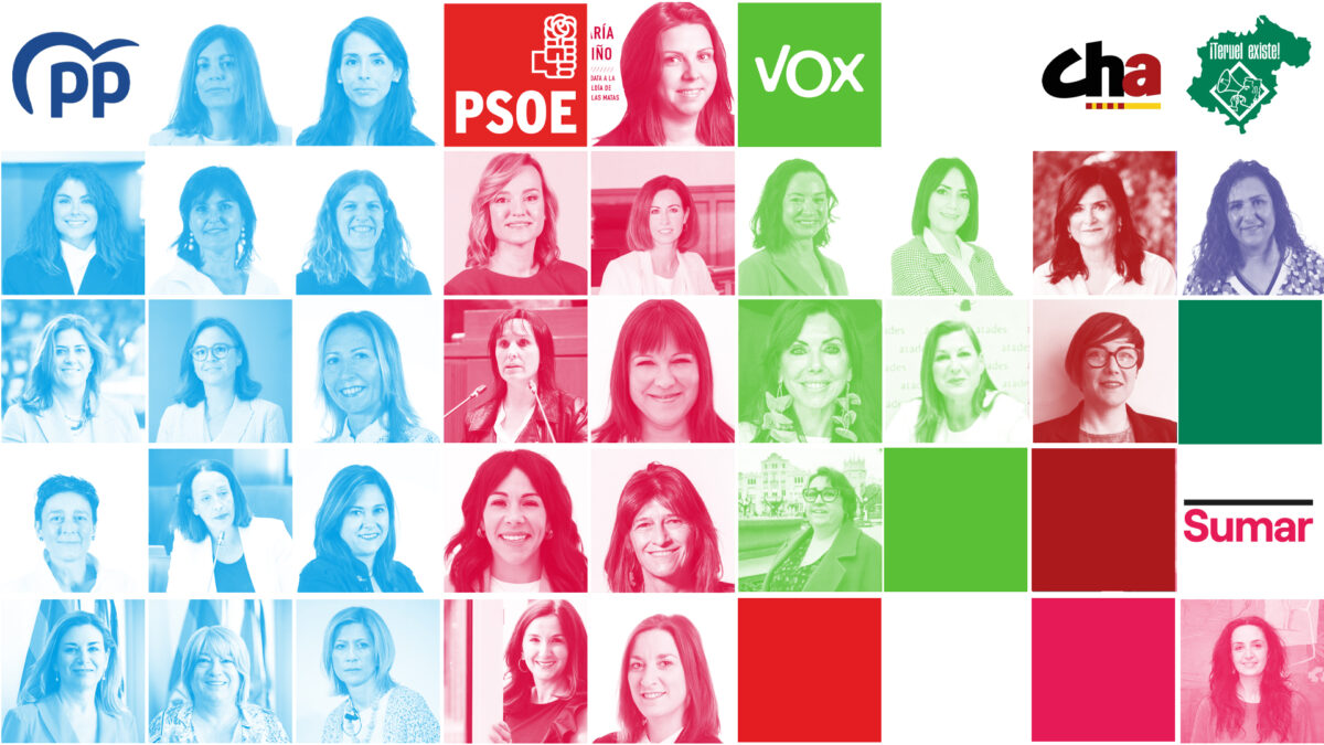 Hasta ahora, el parlamento de Aragón estaba compuesto por 28 mujeres y 39 hombres, lo que significa que hubo un aumento de casi un 8% de representación femenina. El PP aporta 14 parlamentarias, el PSOE nueve, Vox cinco, la Chunta Aragonesista tres, Podemos uno y Sumar-IU, uno. A nivel porcentual los populares tienen un 42% de esa representación en sus filas.