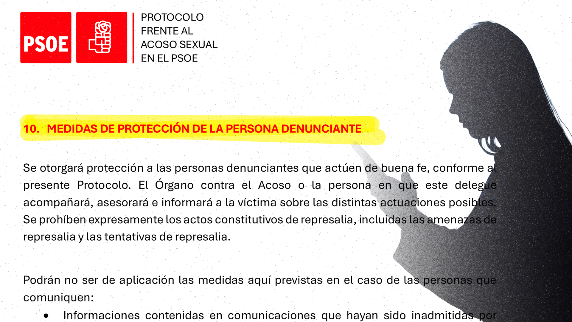 Por añadidura, el protocolo recoge lo siguiente: “El Órgano contra el Acoso o la persona en que este delegue acompañará, asesorará e informará a la víctima sobre las distintas actuaciones posibles. Se prohíben expresamente los actos constitutivos de represalia, incluidas las amenazas”. Lo que significa que, durante este tiempo, las denunciantes no contaron con la protección que les garantiza el sistema.
