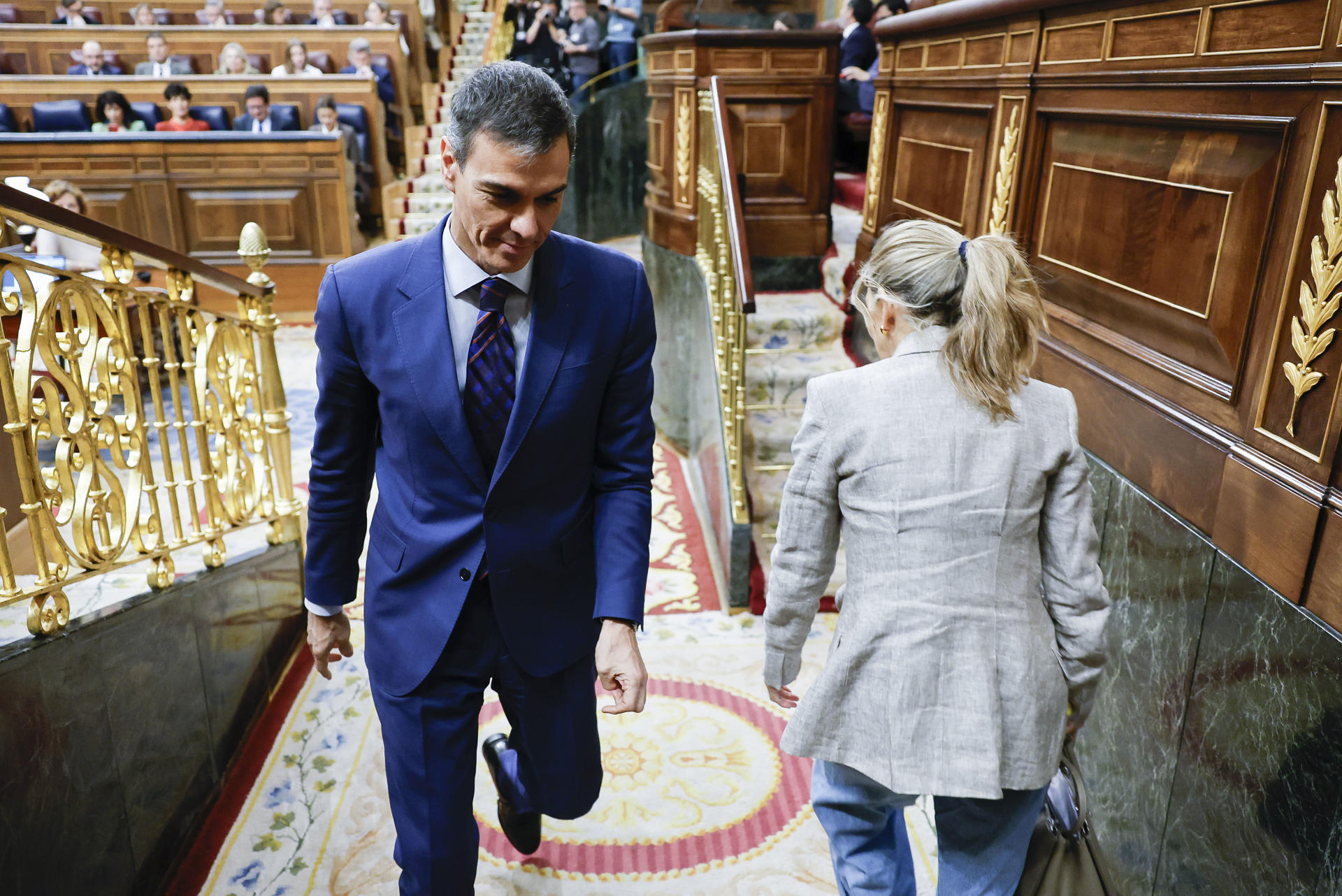 Pedro Sánchez, se cruza con la vicepresidenta segunda y ministra de Trabajo, Yolanda Díaz, este miércoles en el Congreso.