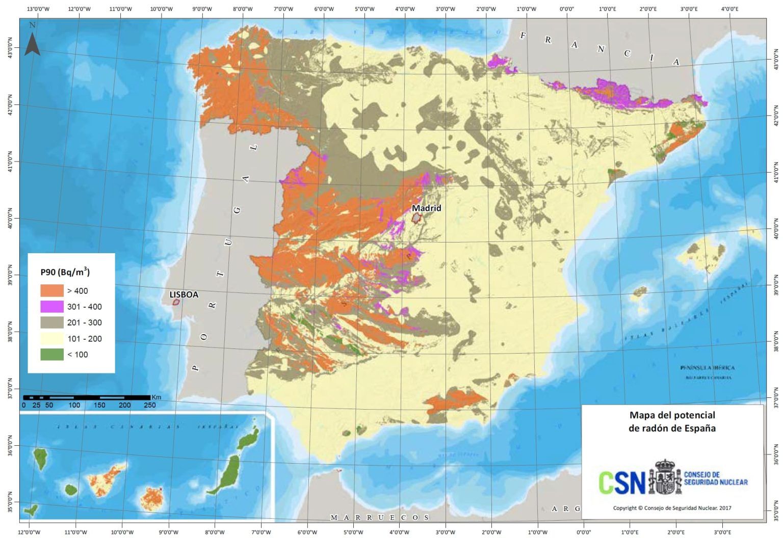 España, especialmente en zonas graníticas como Galicia, Extremadura, Castilla y León o el norte de Madrid, presenta concentraciones elevadas. El Consejo de Seguridad Nuclear elaboró un mapa que identifica municipios de “actuación prioritaria”, donde hasta el 75 % de las edificaciones superan los niveles recomendados.