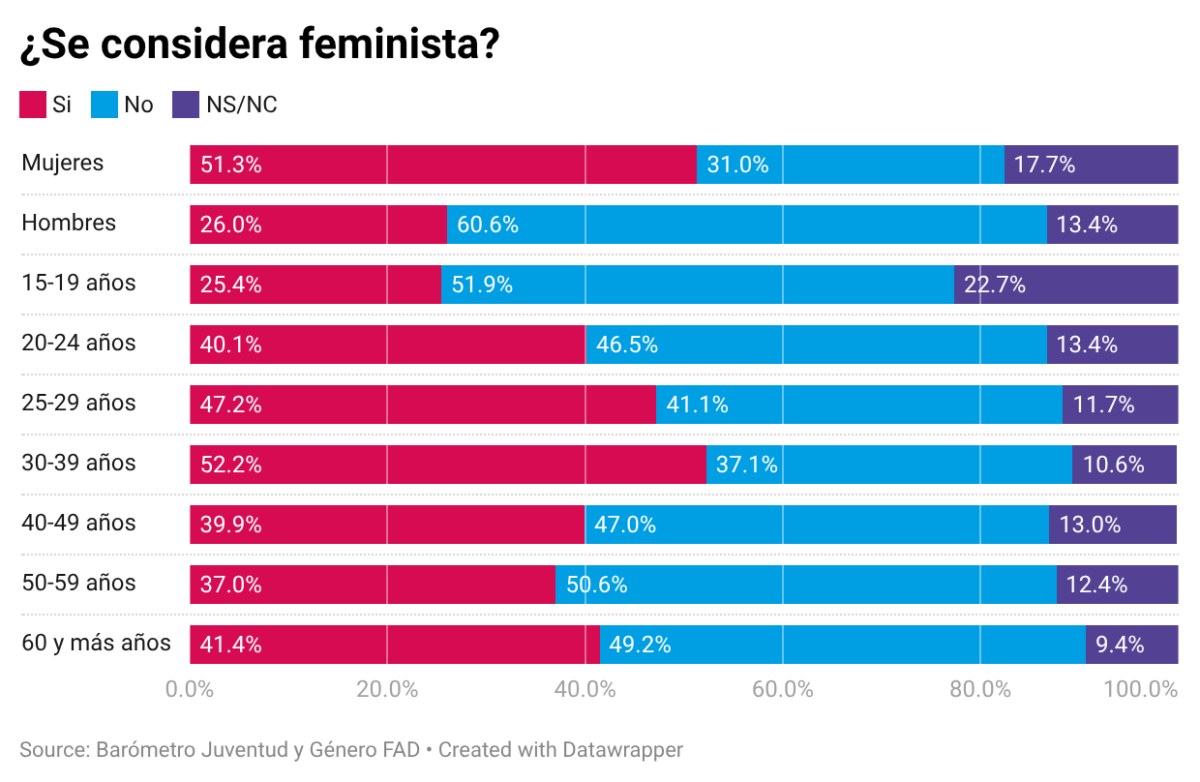 Son datos que reflejan que la juventud española se encuentra en un momento de fuerte conciencia social sobre las desigualdades de género, aunque su percepción y posicionamiento frente al feminismo presentan matices importantes. Cerca de la mitad (49,2%) lo percibe como una herramienta de manipulación política; el 46,1% cree que se ha llegado demasiado lejos en la promoción de la igualdad y que ahora se discrimina a los hombres; y el 50,8% considera que los varones están desprotegidos ante denuncias falsas.