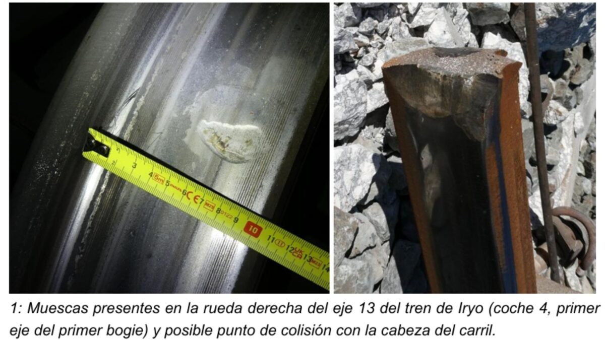 “El hecho de que las muescas estén presentes solo en las ruedas de los ejes impares de la composición es compatible con el hecho de que la primera rueda de cada bogie recibiese el impacto de la cabeza del carril fracturado”, señala el informe.