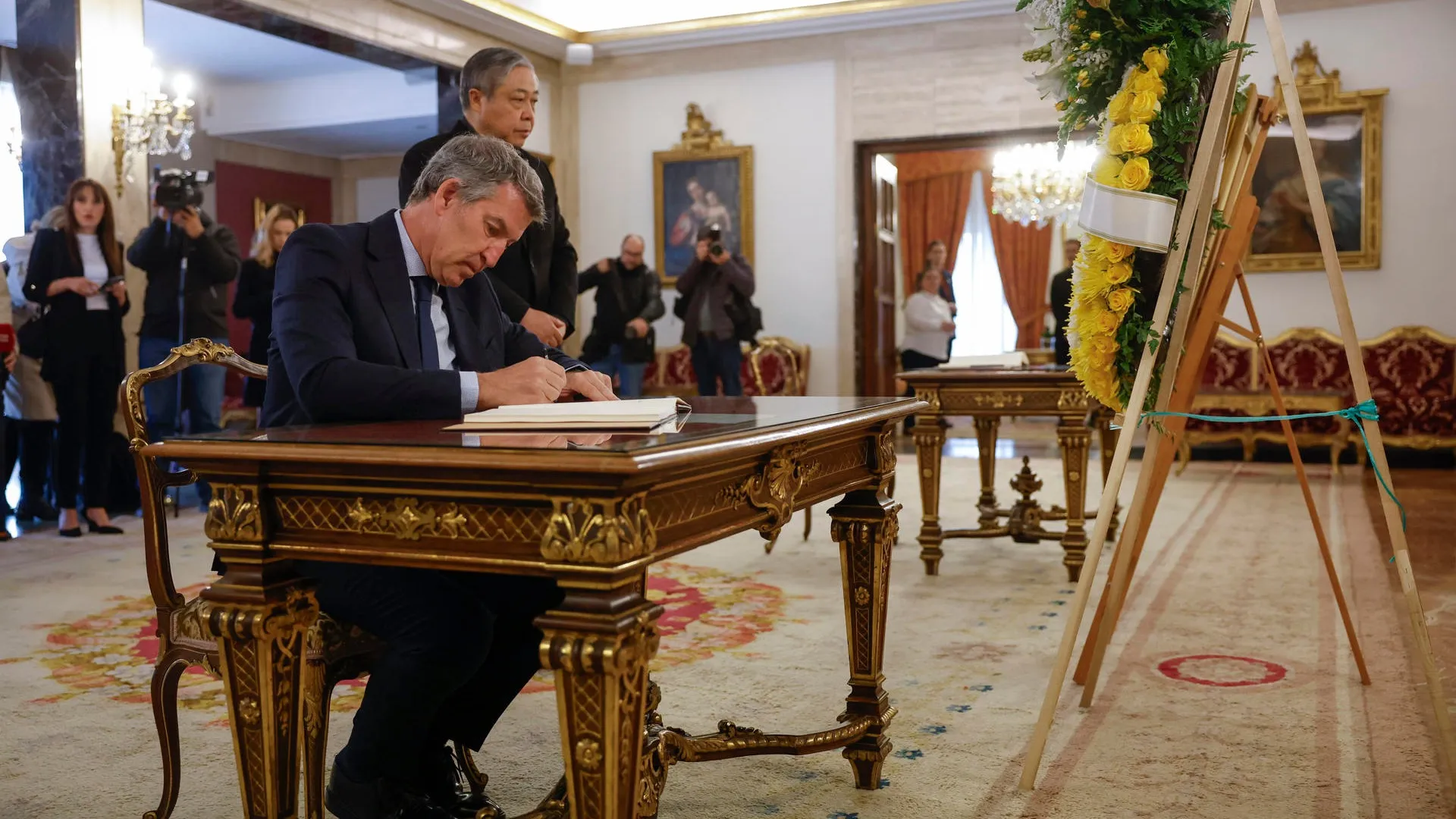 Alberto Núñez Feijóo firma en el libro de condolencias abierto este martes en la Nunciatura Apostólica en Madrid