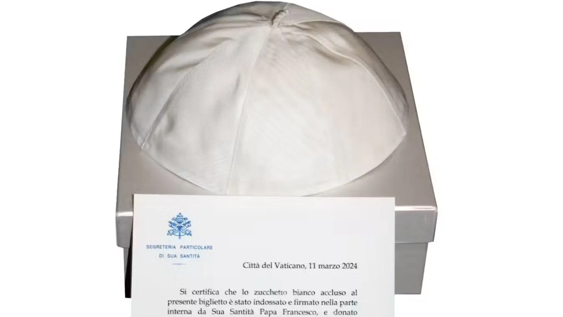 Este peculiar casquete de seda blanca, usado por Francisco, firmado personalmente en su interior, incluye un certificado oficial firmado por el secretario personal del Pontífice argentino, Fabio Salerno, y un sello en relieve de la Secretaría Pontificia.