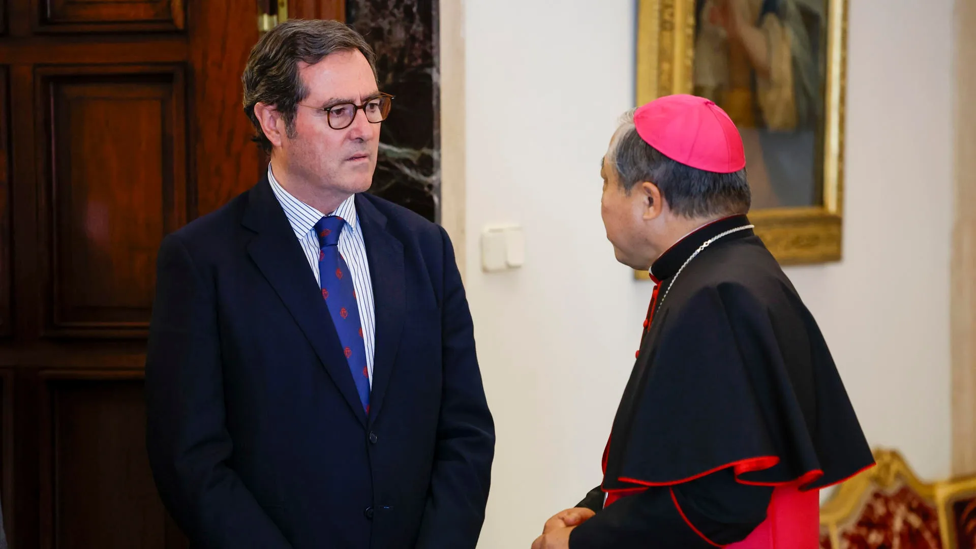 El presidente de la CEOE, Antonio Garamendi, firma en el libro de condolencias en la Nunciatura de Madrid