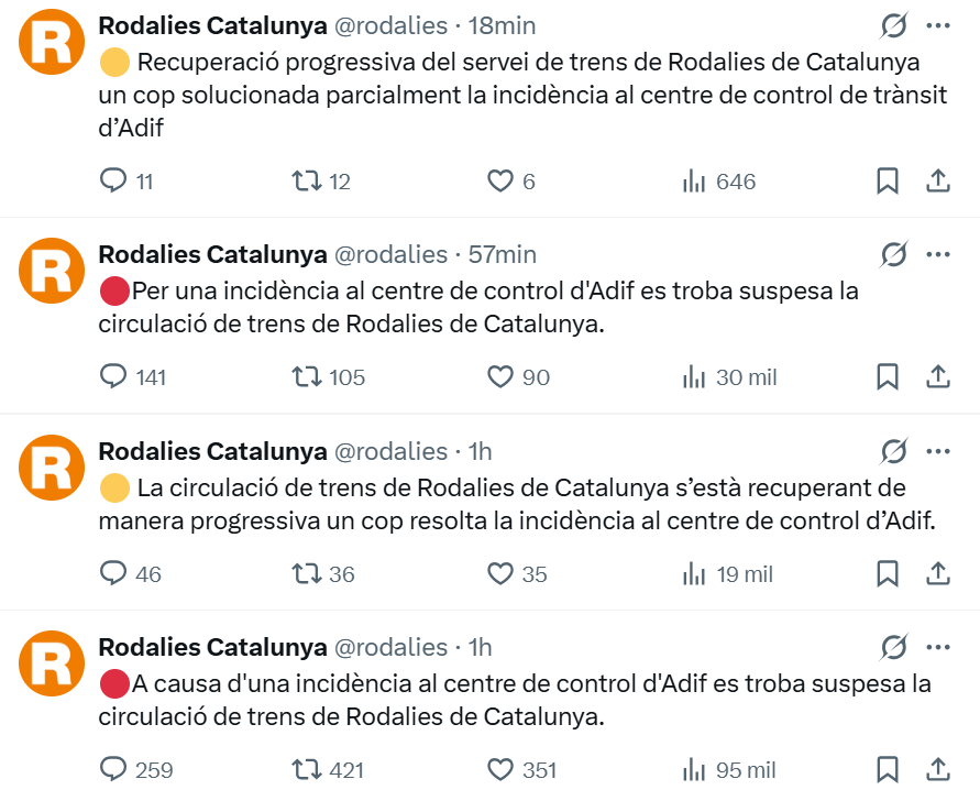 Escasas horas antes se ha producido una confusa secuencia con respecto a la vuelta de dicho servicio. A las 5:24 horas Rodalies ha anunciado que se retomaba parcialmente la circulación de algunos trenes, mientras que a las 6:44 se volvía a suspender debido a una incidencia en el centro de control de Adif. Esta secuencia se ha repetido una segunda vez, pues el servicio se ha retomado a las 7:14 y se ha suspendido a las 7:21, tal y como se refleja en la cuenta de X de Rodalies.