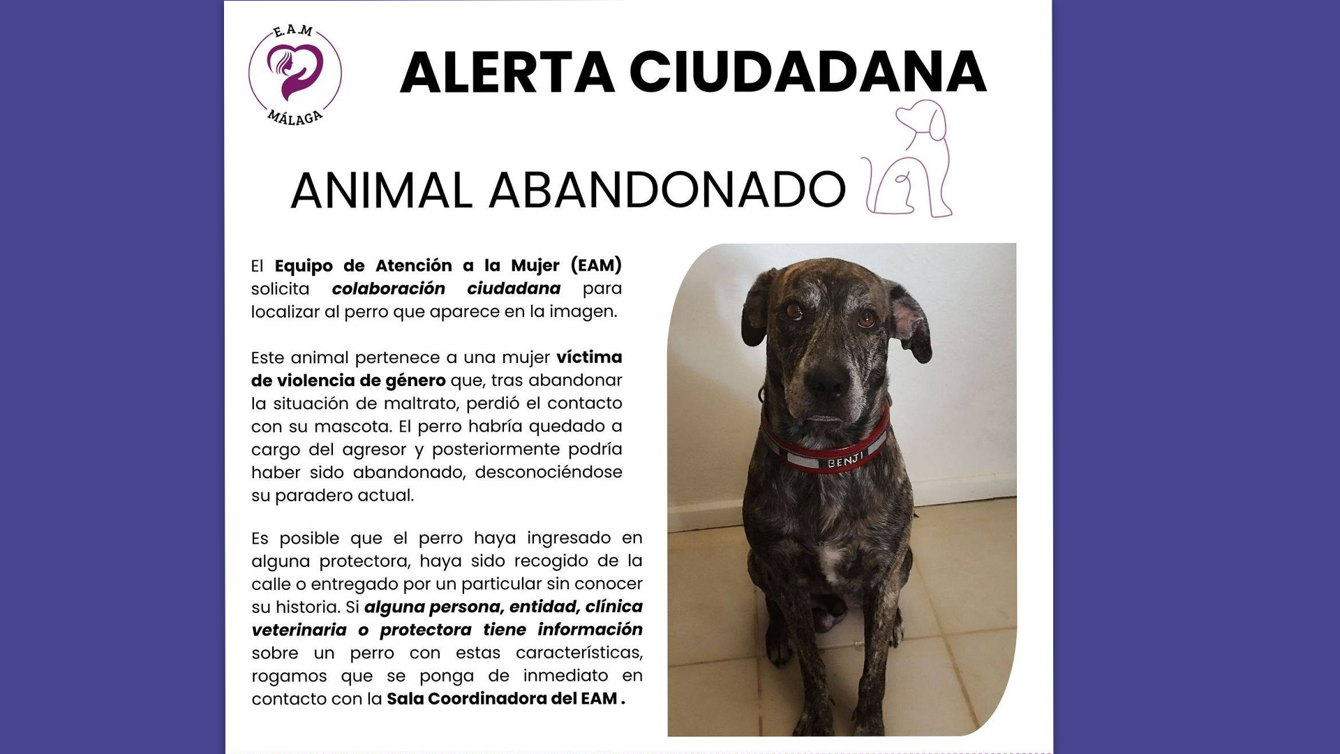 La desaparición de Benji, de apenas dos años, supone una carga emocional añadida para la mujer, que actualmente recibe atención psicológica. En un mensaje publicado en redes sociales, ella misma ha pedido ayuda para encontrarlo: “Benji es mi hijo perruno. Por problemas de violencia de género tuve que irme y no lo pude llevar conmigo. Salí con mis cosas, sin rumbo fijo y sin un lugar seguro donde ir. Aquella noche nos acogieron en un cuarto pequeño y pensé que él seguiría a salvo”.